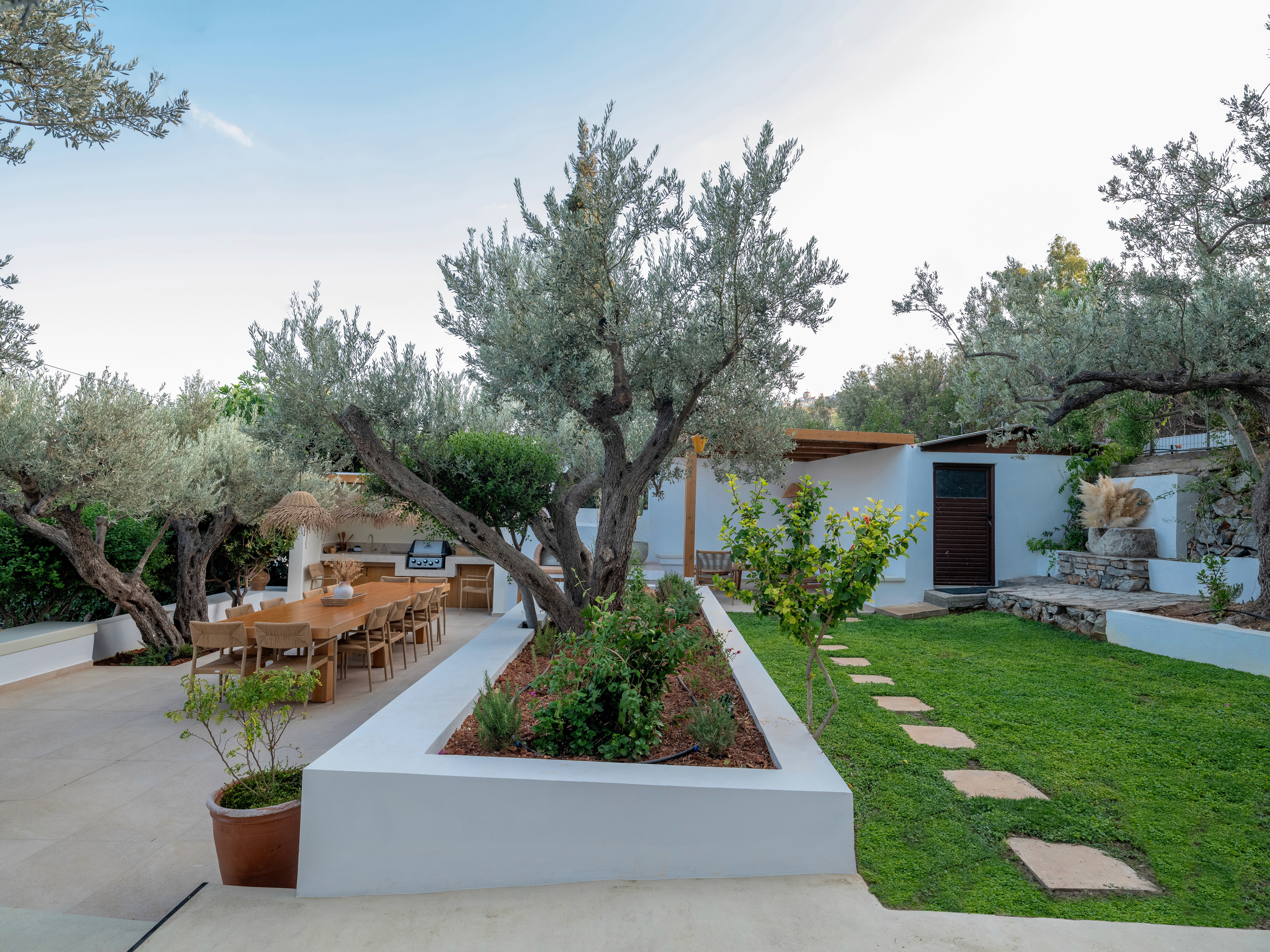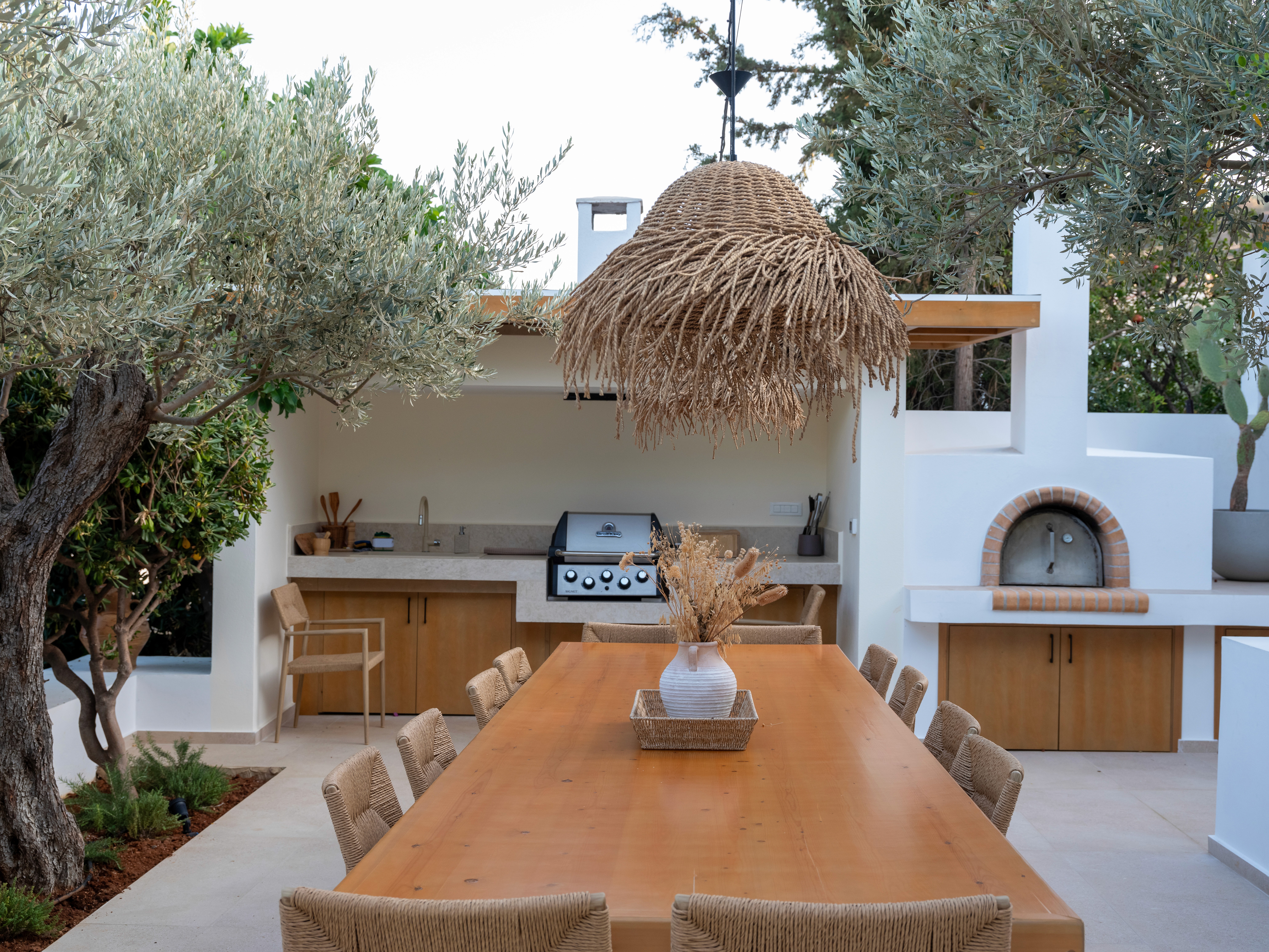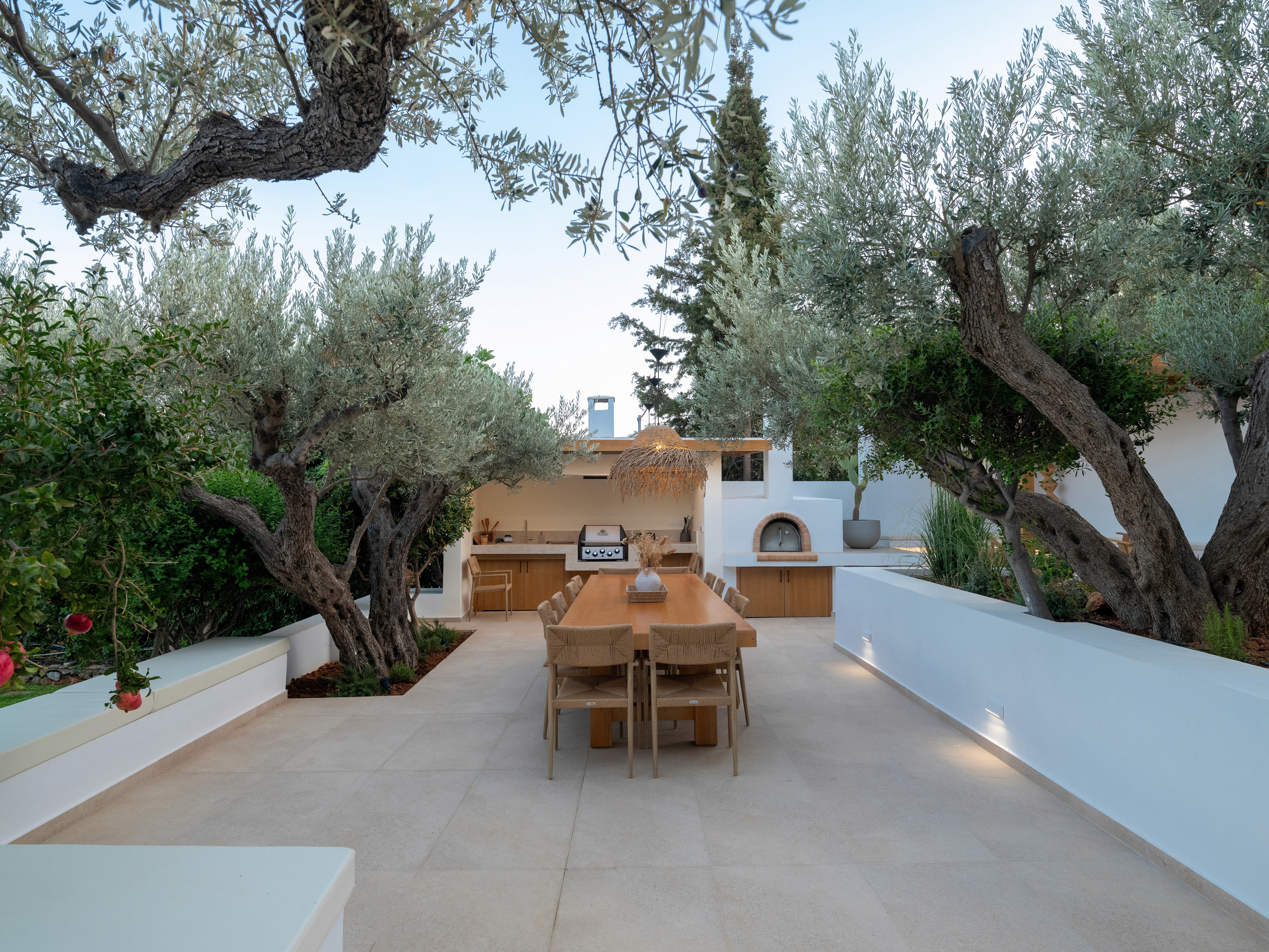 The upper outdoor space is centered around a big barbeque area, seamlessly integrated into a landscape of olive trees. The low white rendered planters, stone paving, and smooth short white walls define distinct zones without interrupting the flow of the garden. These minimalistic, understated boundaries contrast perfectly with the organic forms of the greenery creating a refined, relaxing atmosphere. The long, wooden table with the woven chairs and the build in cooking area with the traditional oven blend supreme craftmanship with functional design while the same color and earthly material palette is used producing a sense of understated luxury.