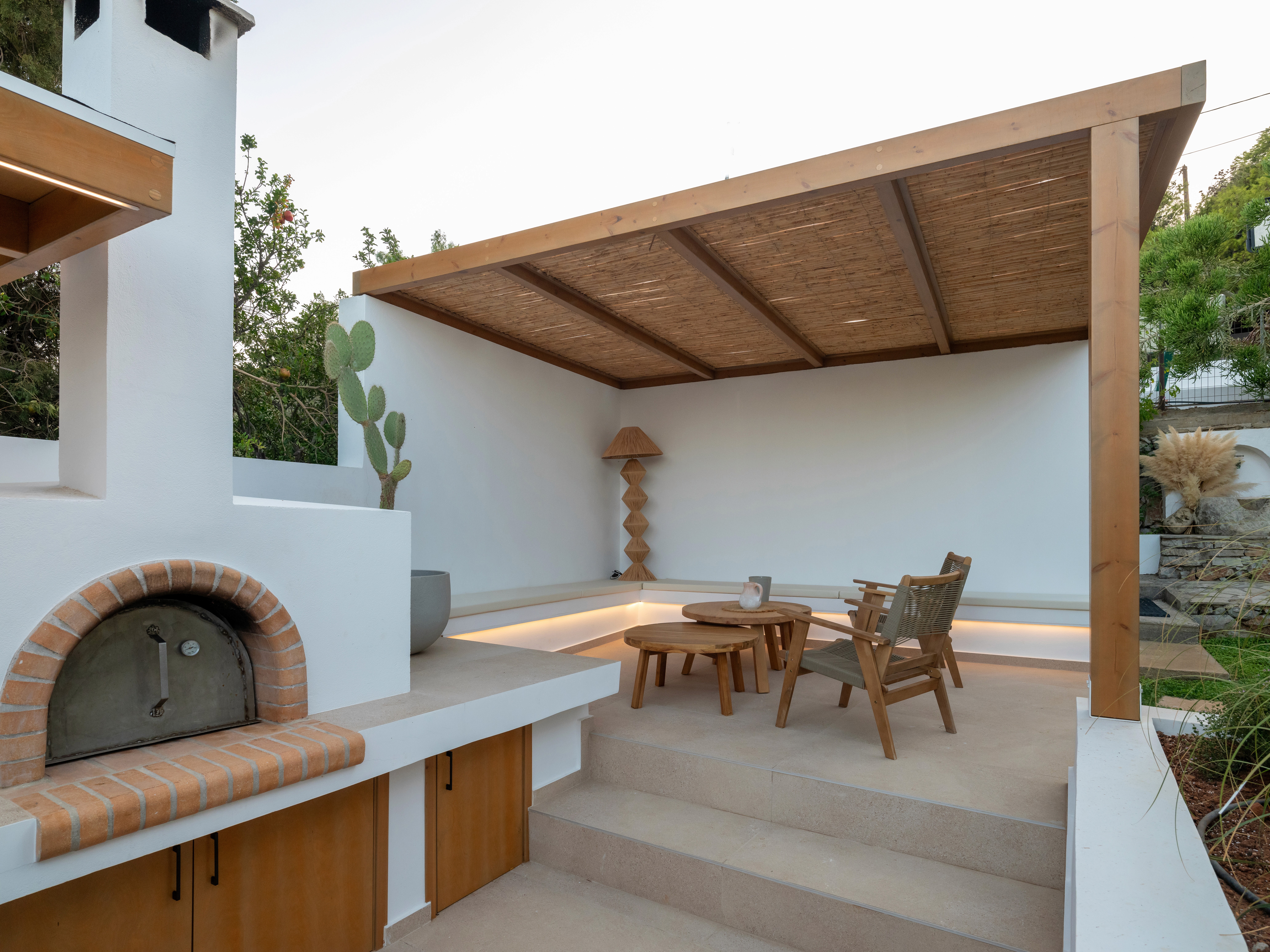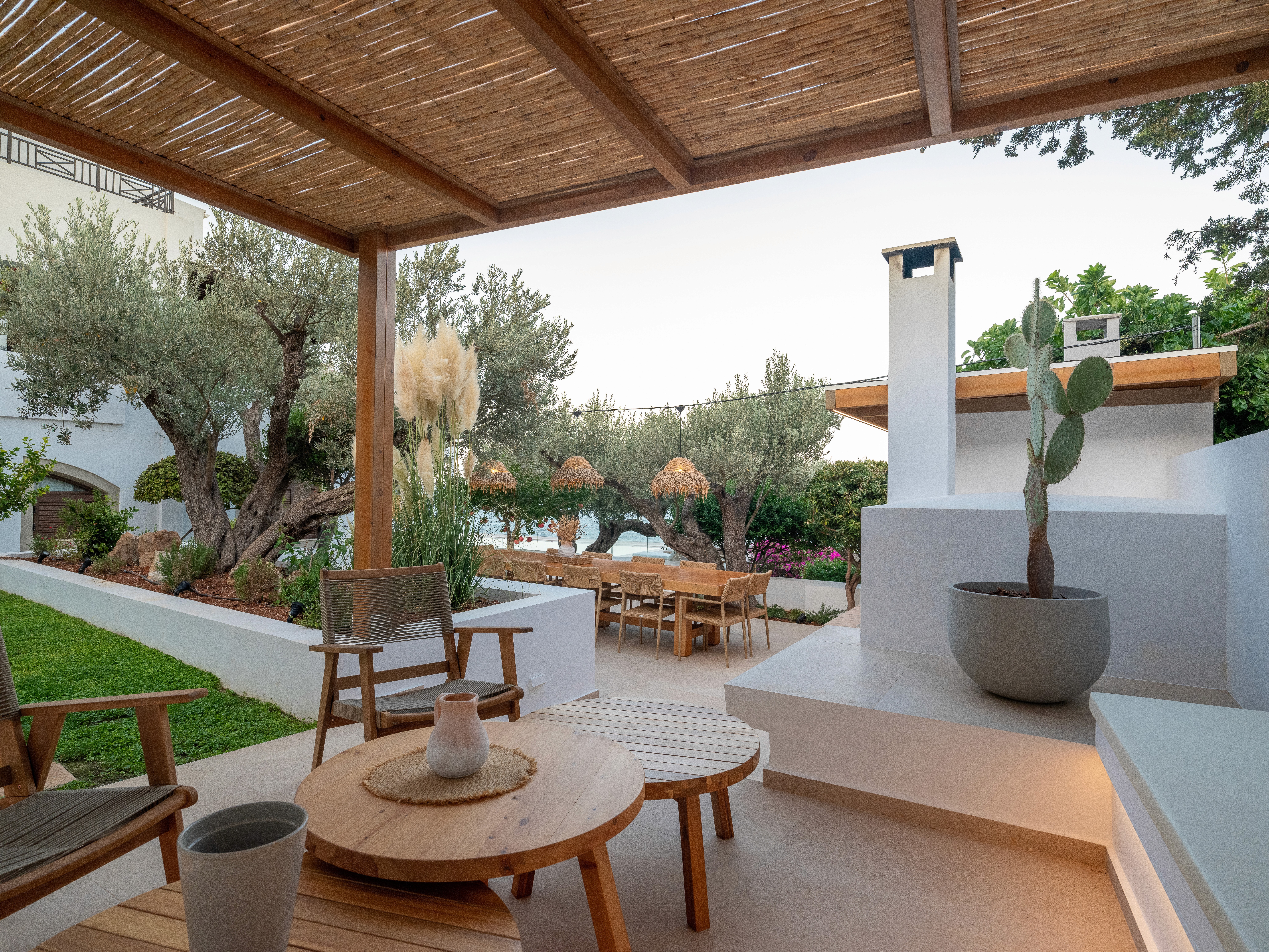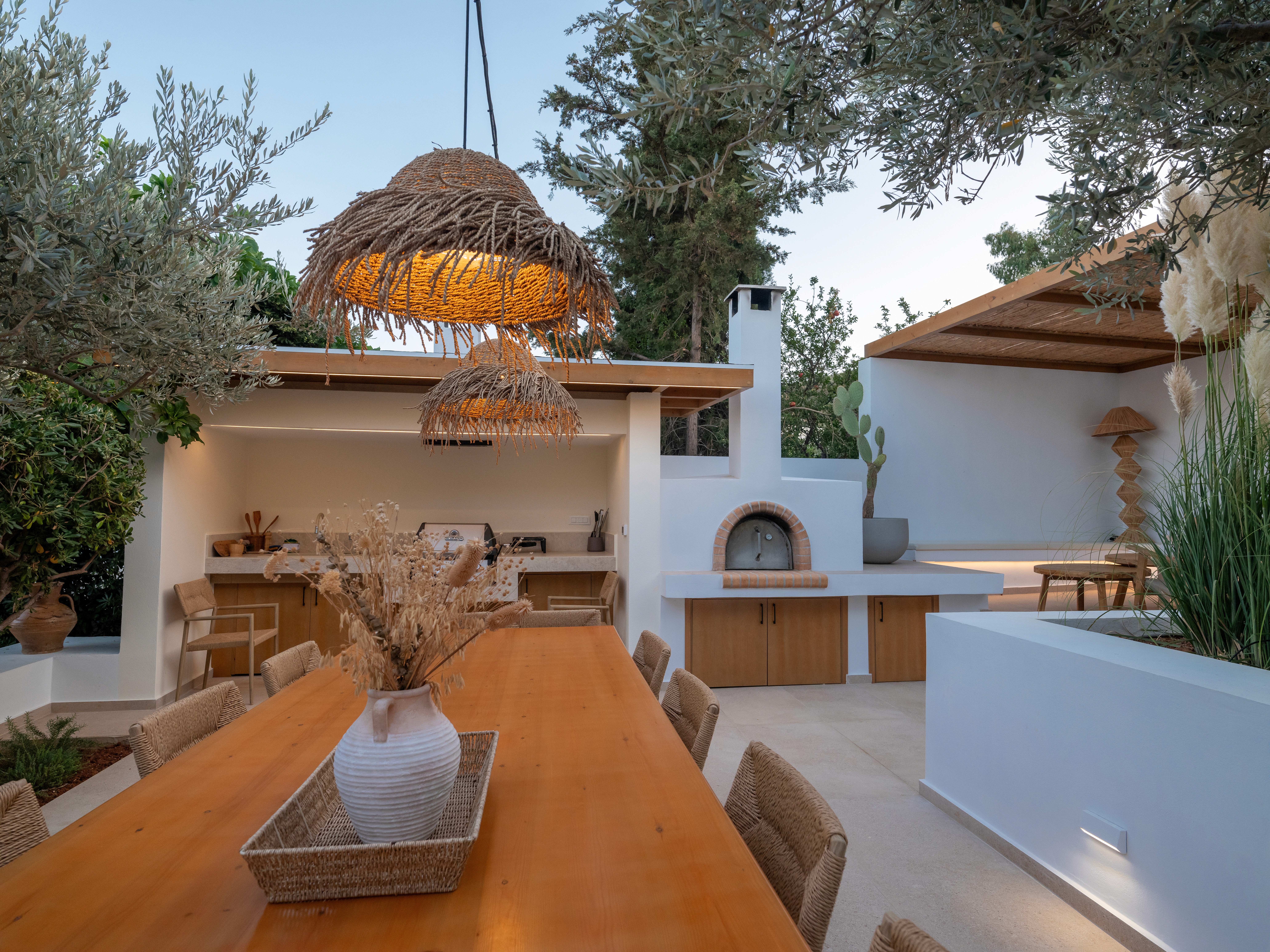 The upper outdoor space is centered around a big barbeque area, seamlessly integrated into a landscape of olive trees. The low white rendered planters, stone paving, and smooth short white walls define distinct zones without interrupting the flow of the garden. These minimalistic, understated boundaries contrast perfectly with the organic forms of the greenery creating a refined, relaxing atmosphere. The long, wooden table with the woven chairs and the build in cooking area with the traditional oven blend supreme craftmanship with functional design while the same color and earthly material palette is used producing a sense of understated luxury.
