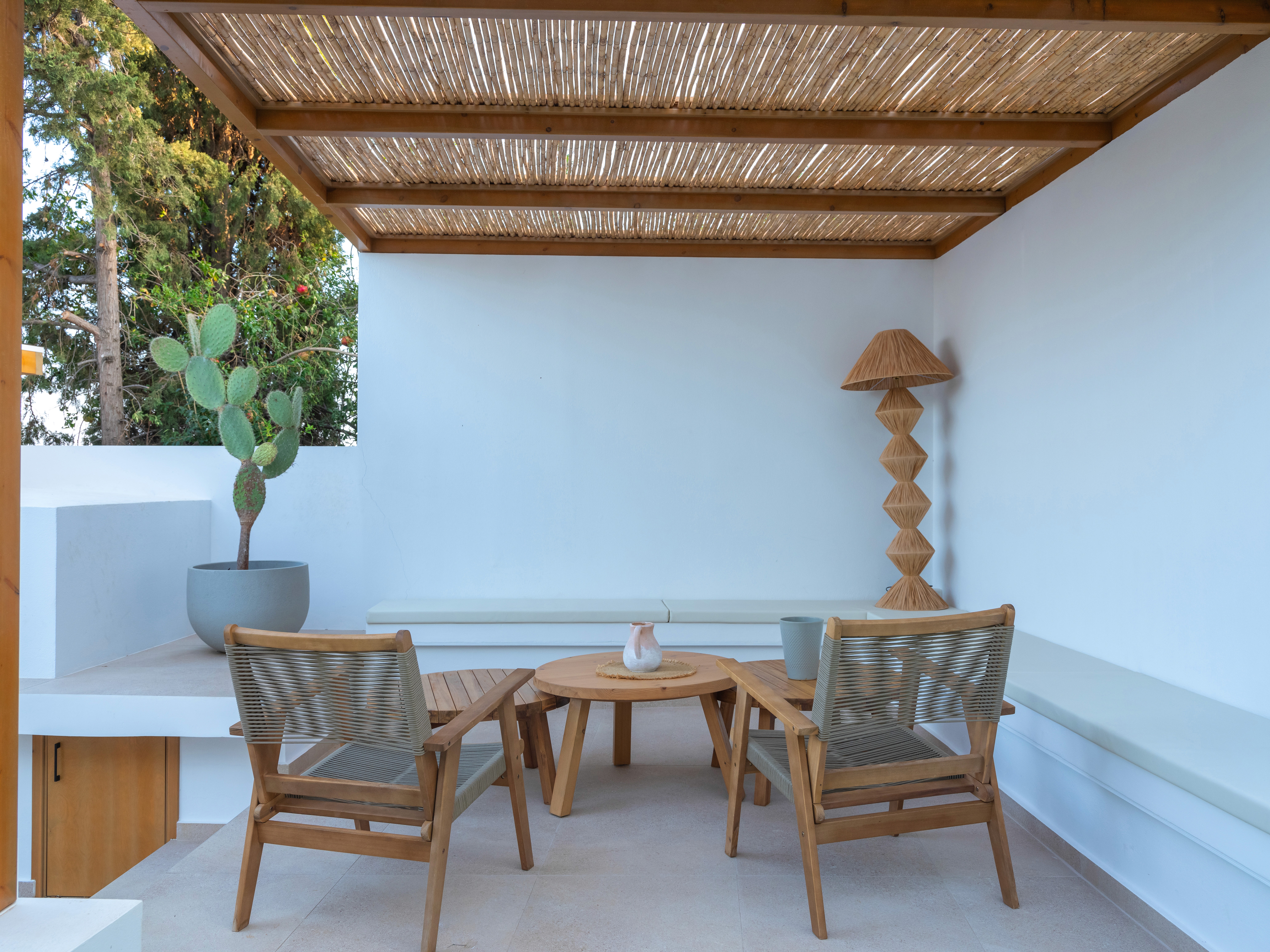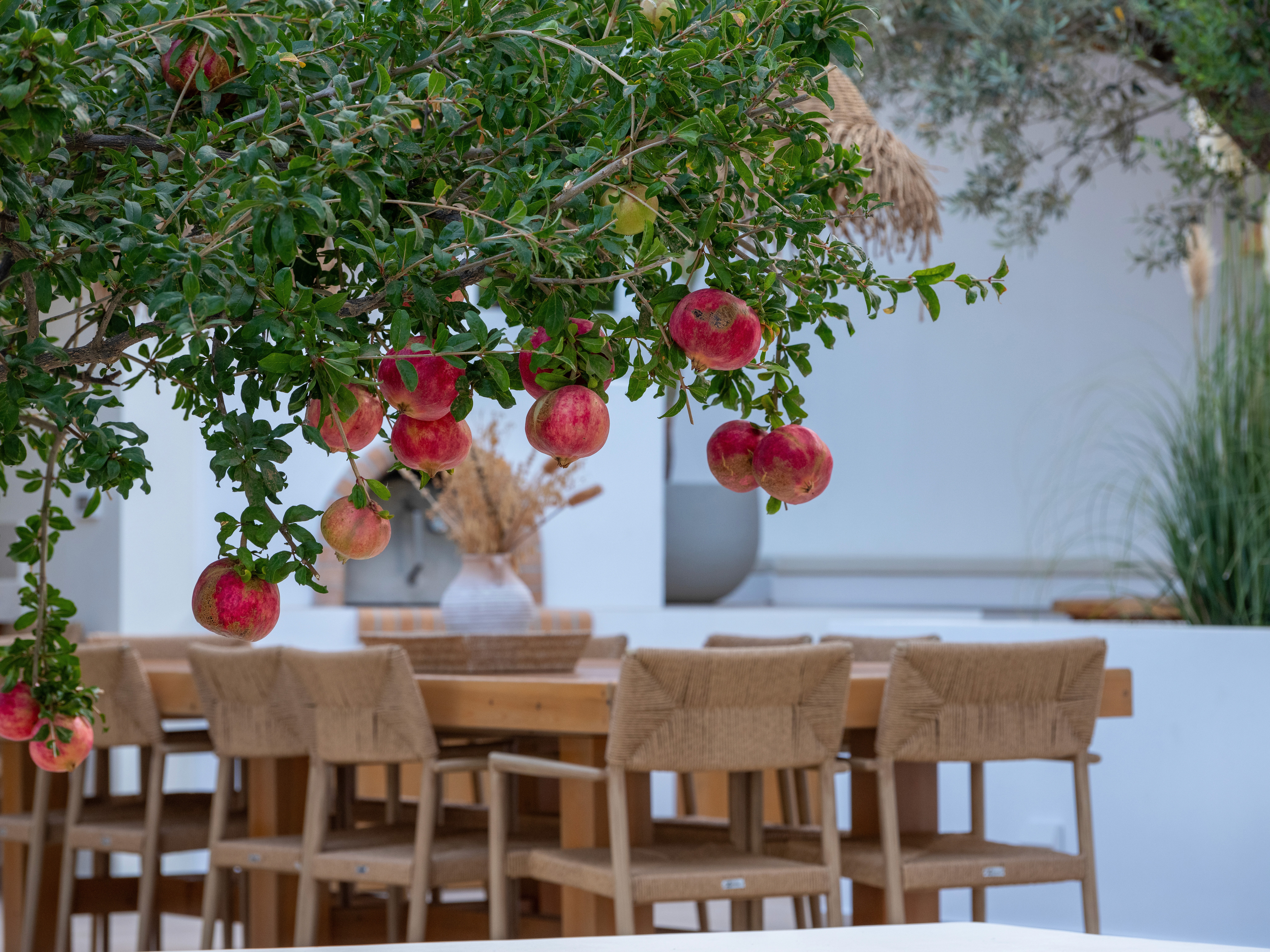The dining area surrounding built-in planters are clad in crisp white masonry, which contrasts with the earthy tones of the wood and terracotta, and mirrors the clean lines of the Mediterranean architectural style.