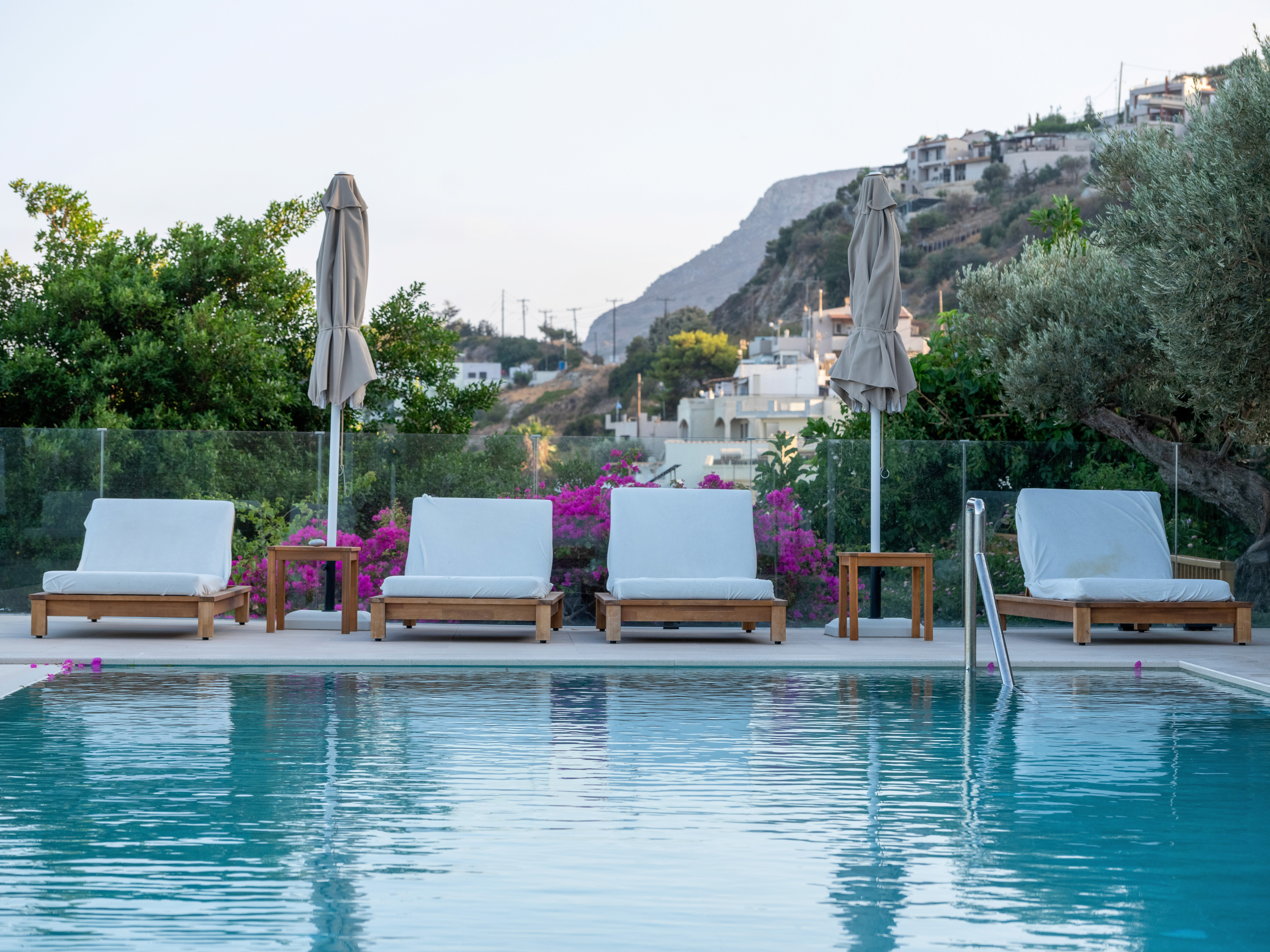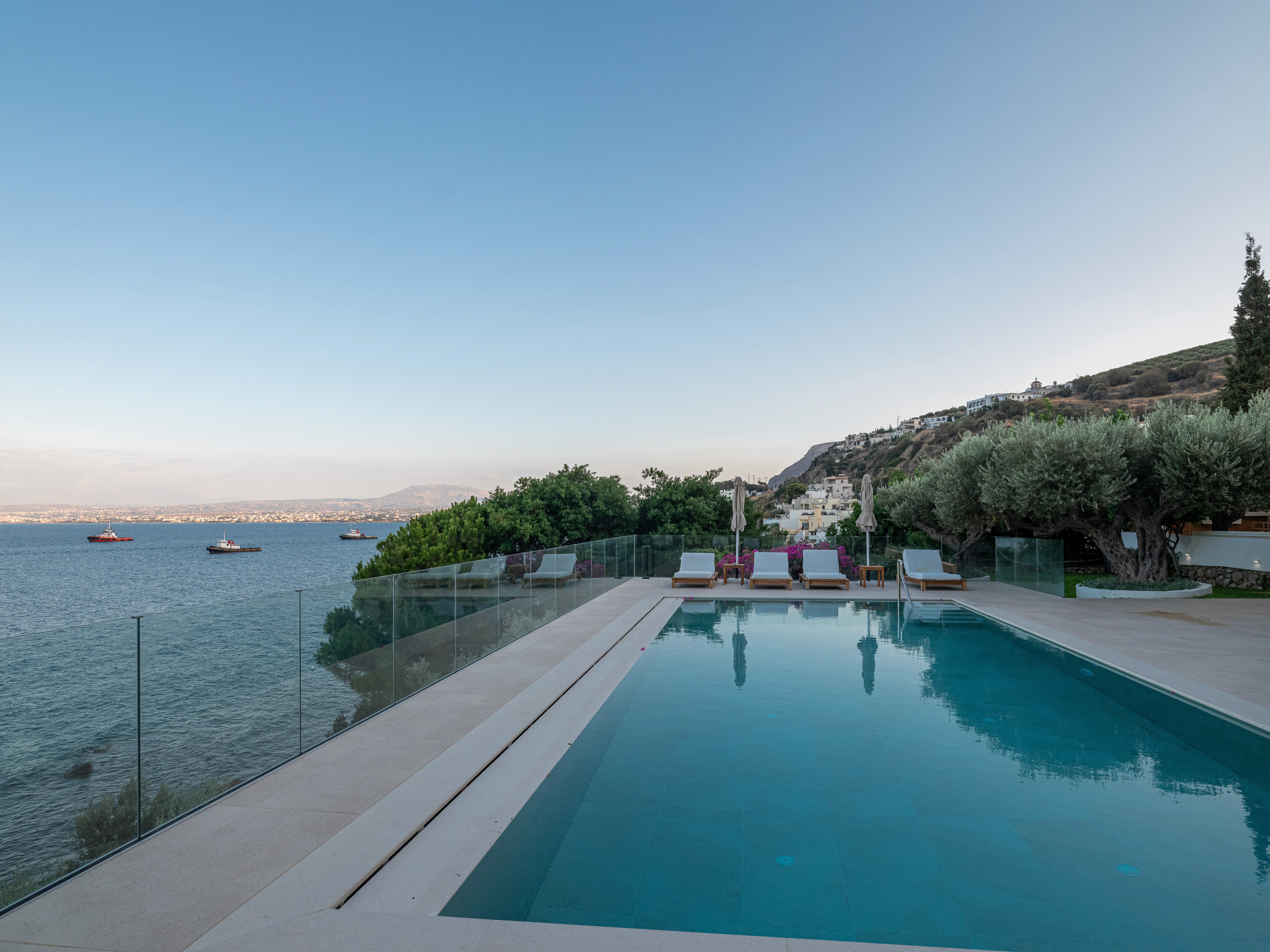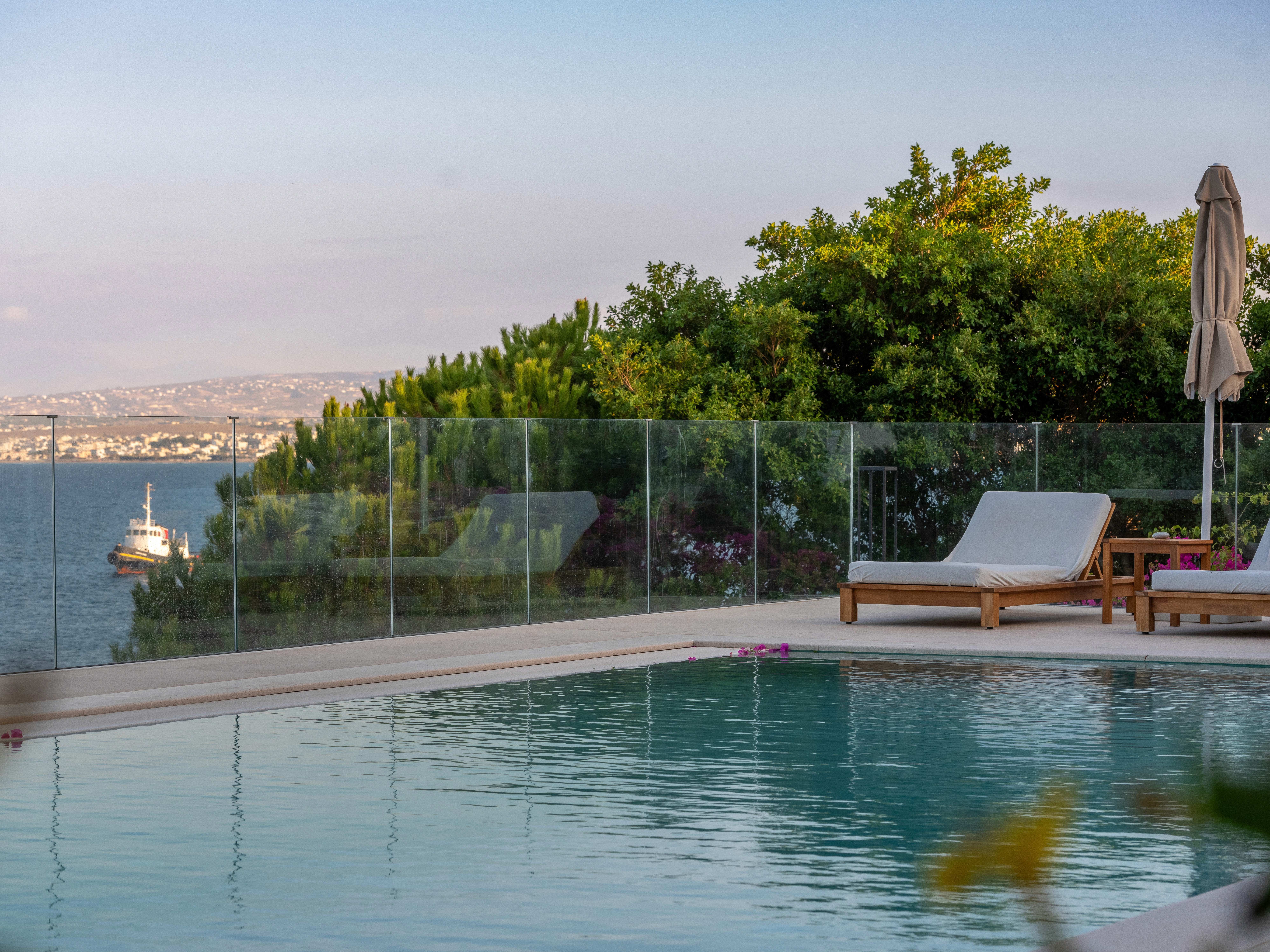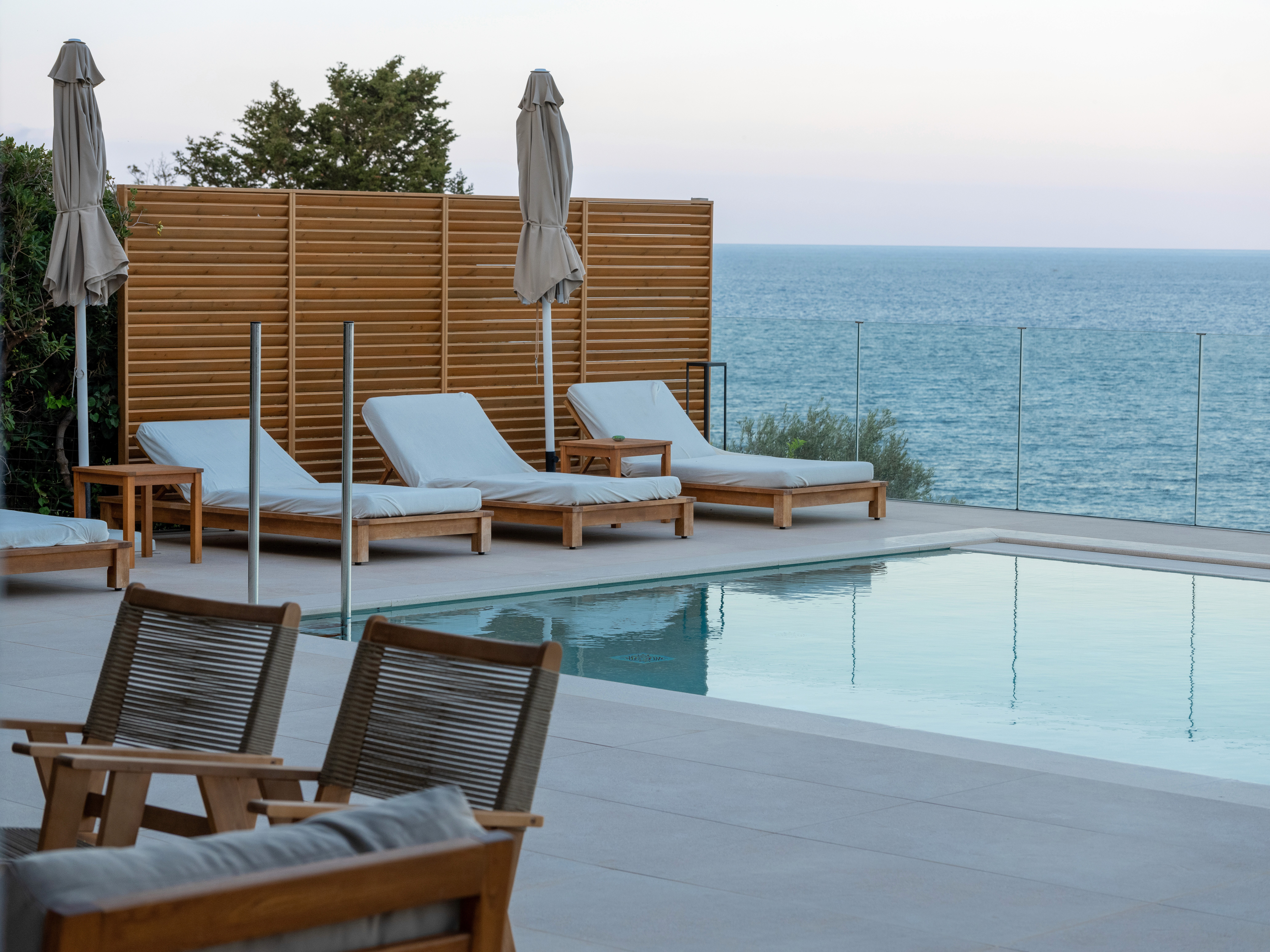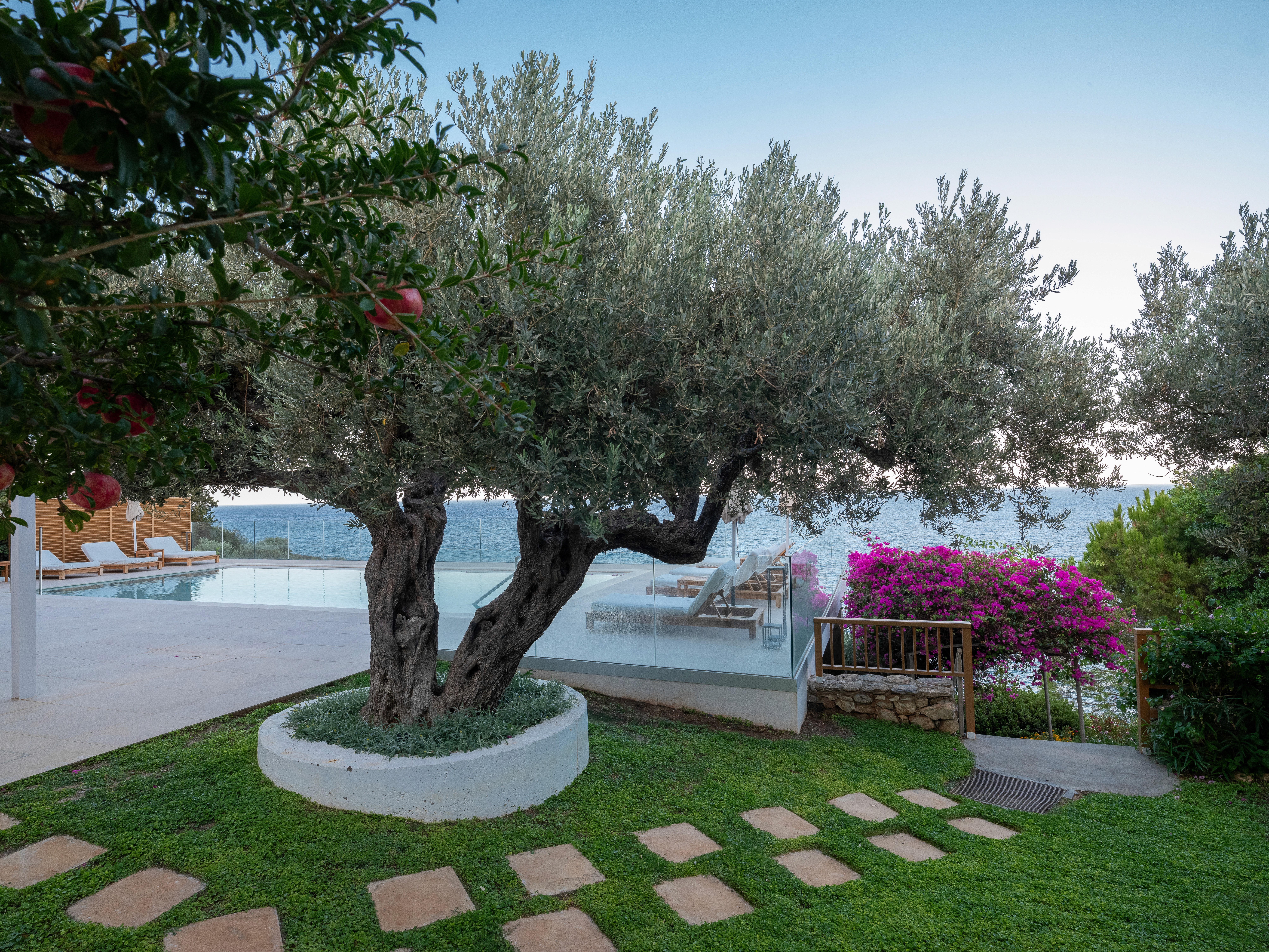 Beyond the garden, the pool terrace offers a seamless transition from the greenery to an expansive sea view. The use of pale stone flooring and teak furniture continues the restrained natural, earthly palette, emphasizing serenity and continuity between architecture and landscape. A glass rail ensures unobstructed views while reinforcing the clean, modern aesthetic allowing the natural horizon to become an integral part of the design. Overall, the garden enforces a dialogue between tradition and modernity, a Mediterranean retreat where simplicity, craftsmanship, and nature coexist in harmonious balance.
