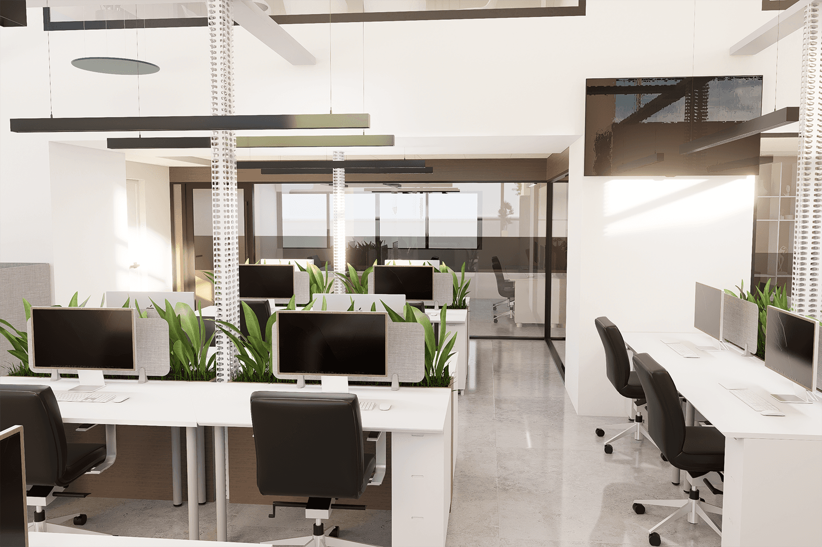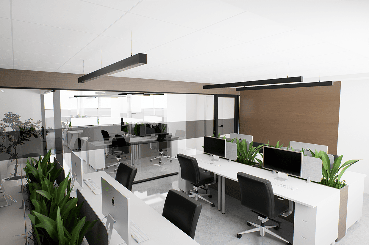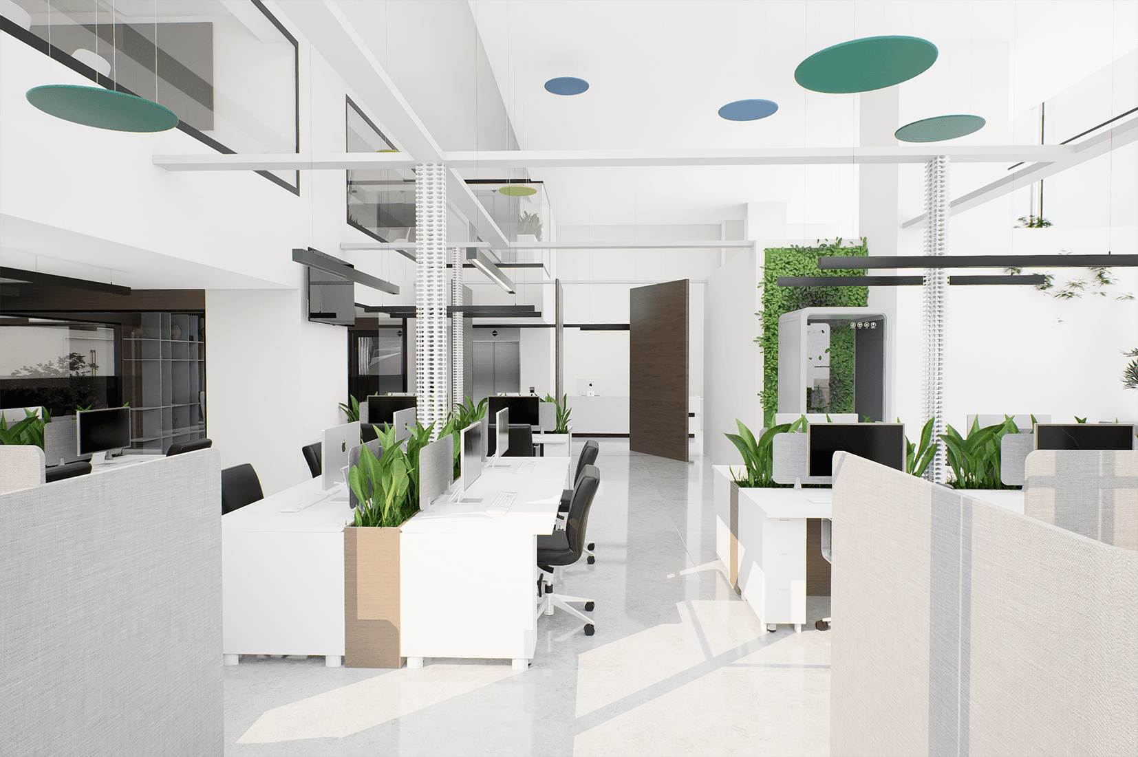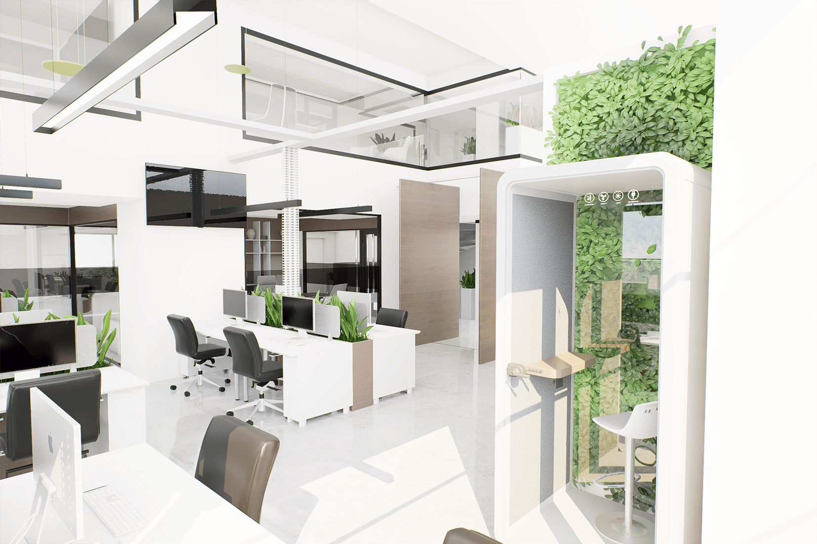 Greenery is used around the project as a divisive feature. The greenery creates an aesthetic upgrade of the atmosphere, improves the quality of the air, reduces the echo and benefits the employee's quality of work by lowering anxiety. The lighting is designed by following the circadian rhythm by controling the intensity and temperature of the light, synchronizing with the biological clock of the human. As a result, the employee's mood improves increasing the productivity.