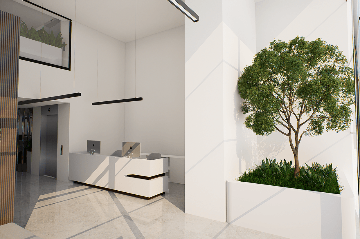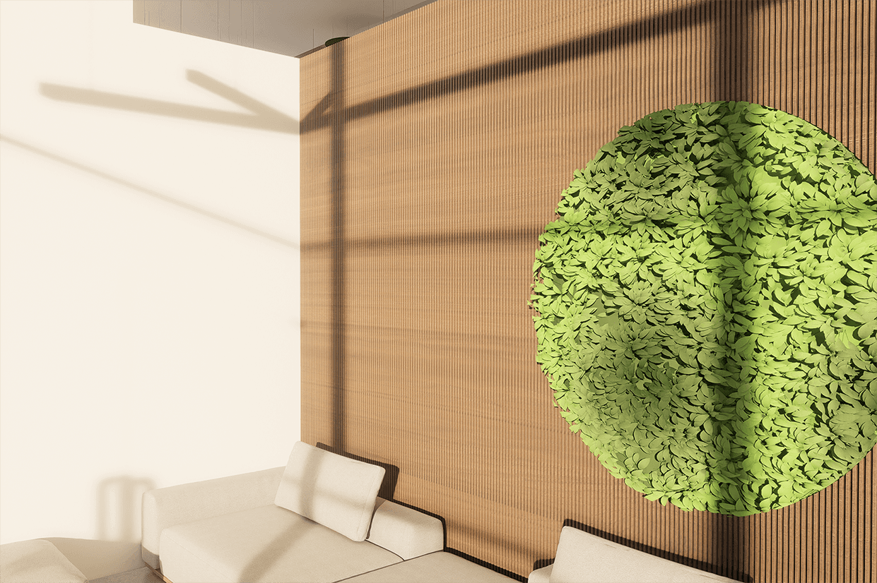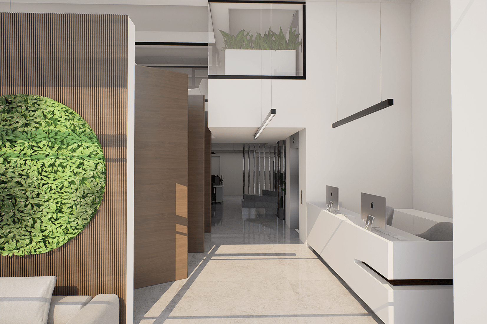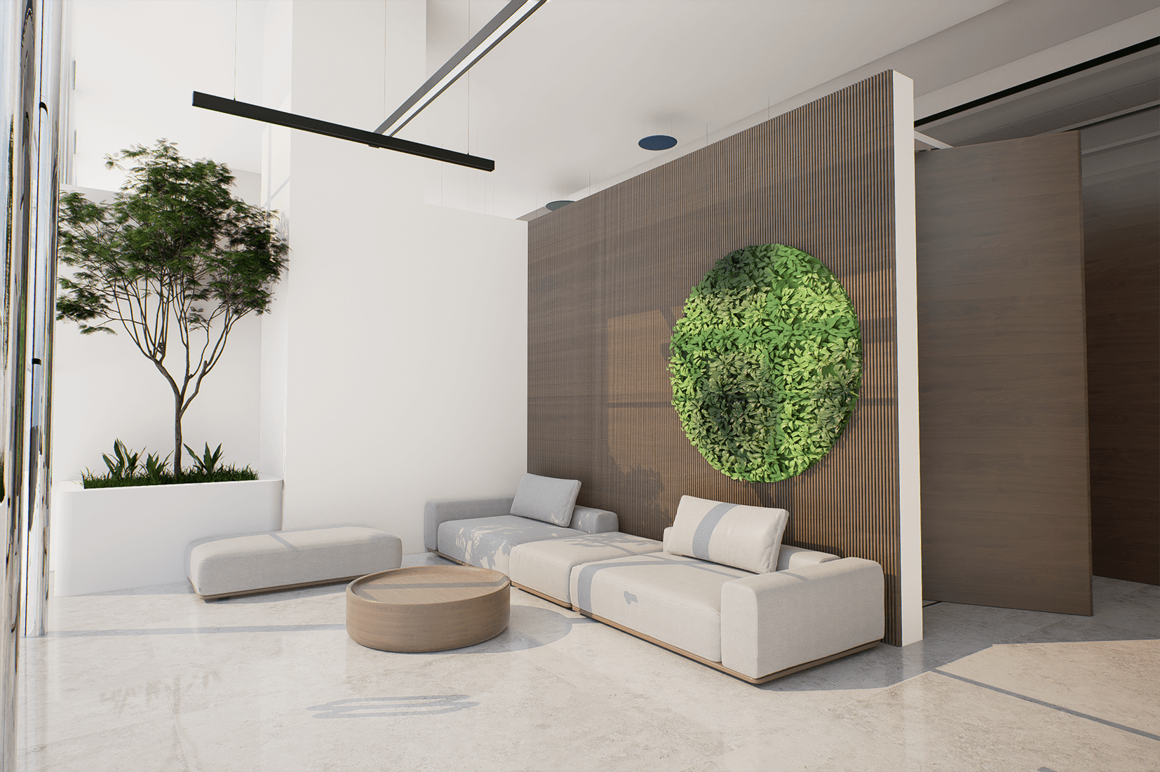 Greenery is used around the project as a divisive feature. The greenery creates an aesthetic upgrade of the atmosphere, improves the quality of the air, reduces the echo and benefits the employee's quality of work by lowering anxiety. The lighting is designed by following the circadian rhythm by controling the intensity and temperature of the light, synchronizing with the biological clock of the human. As a result, the employee's mood improves increasing the productivity.