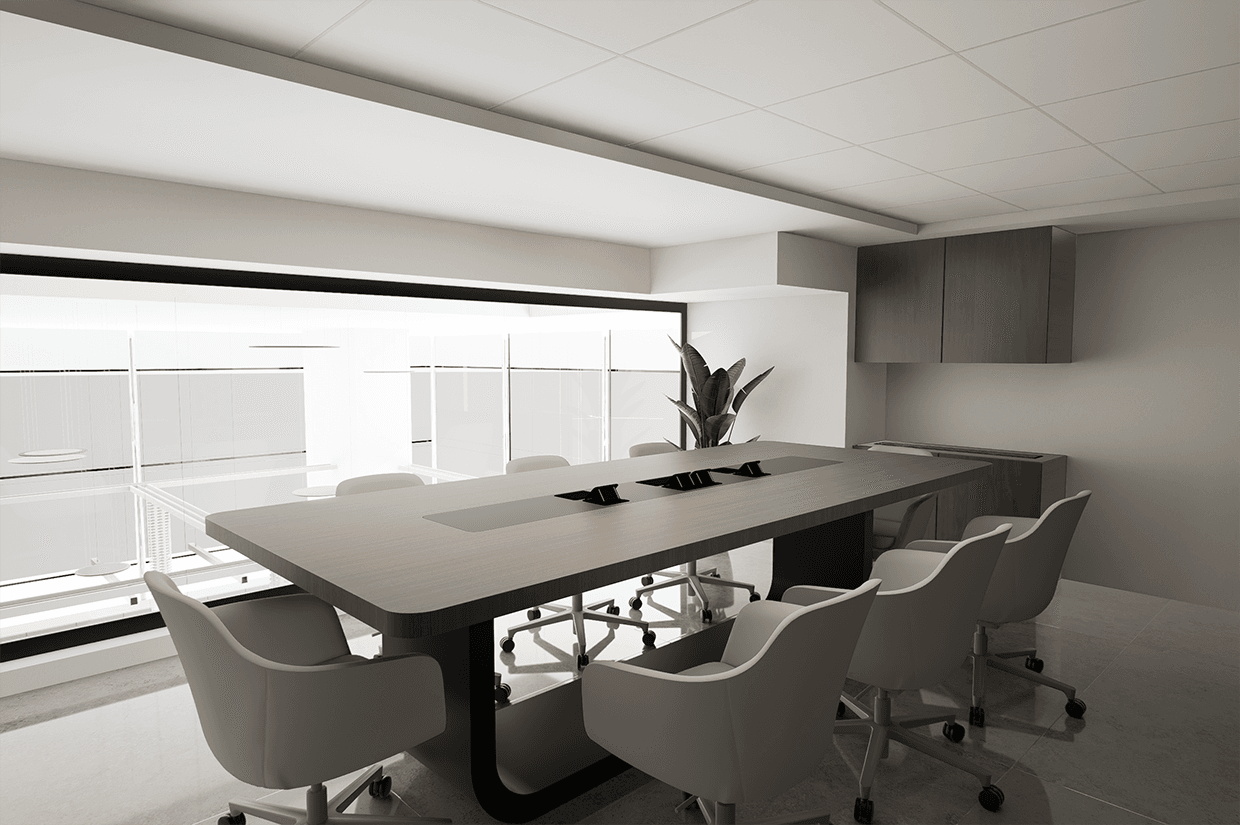 The mezzanine level houses offices for the manager and high ranking officers. Also, a big conference room occupies a large space. Folding walls provide a level of flexibility allowing the space to be configured on demand. The manager offices have direct overview on the main working area allowing him a level of control on the operation of the business. These spaces are enclosed in black-framed glass, allowing transparency while preserving acoustic separation, maintaining the office’s ethos of openness and collaboration.