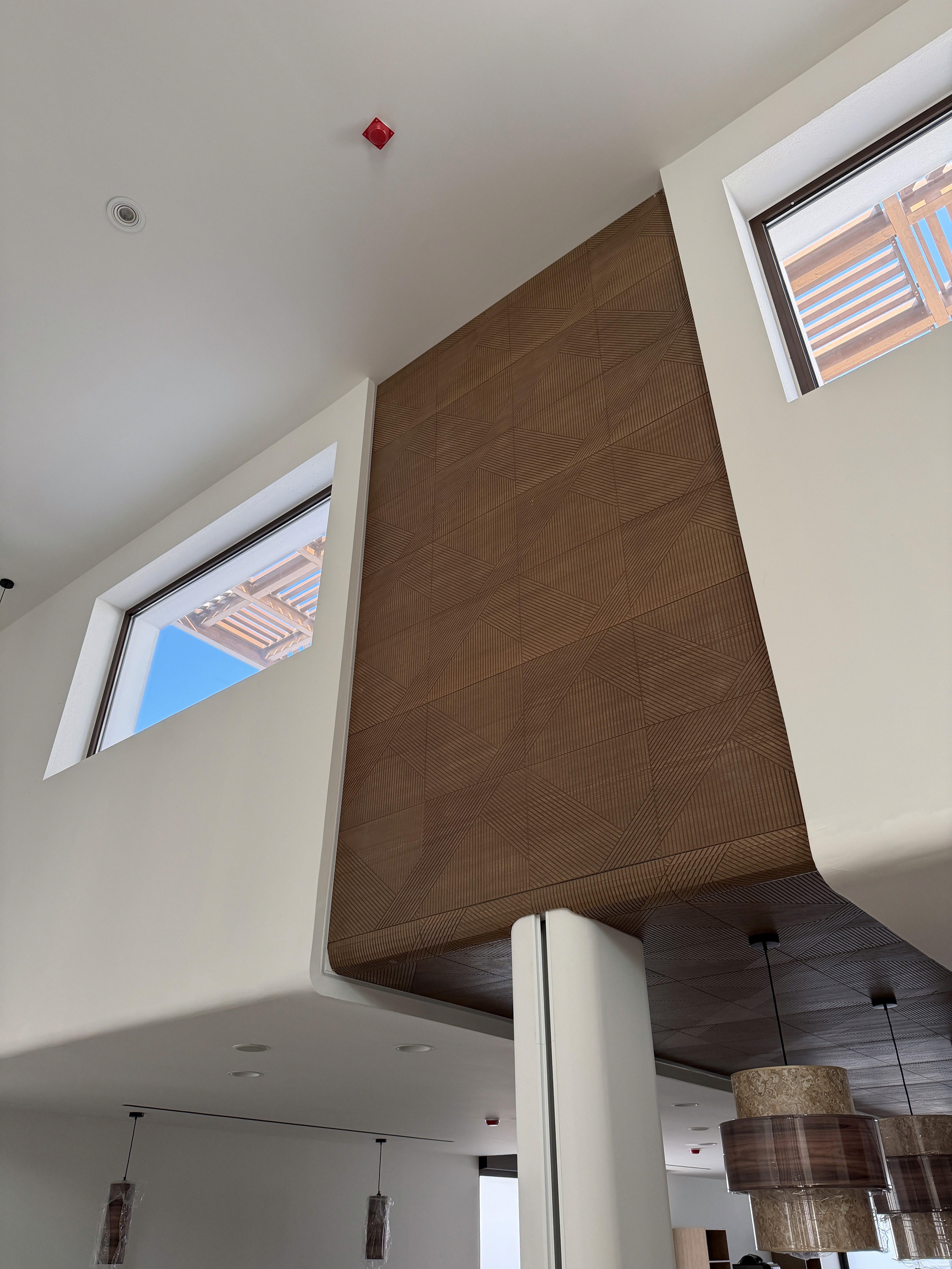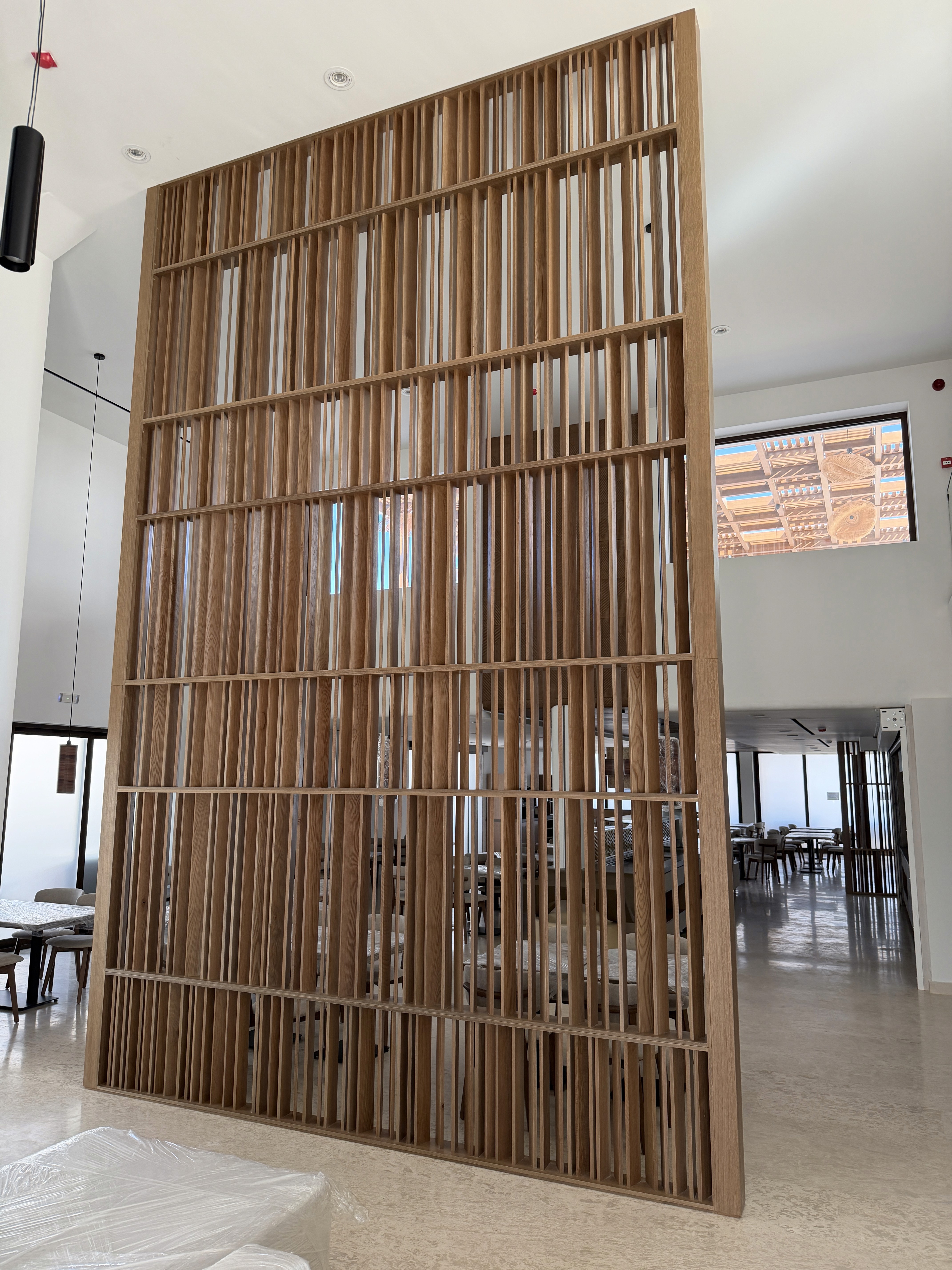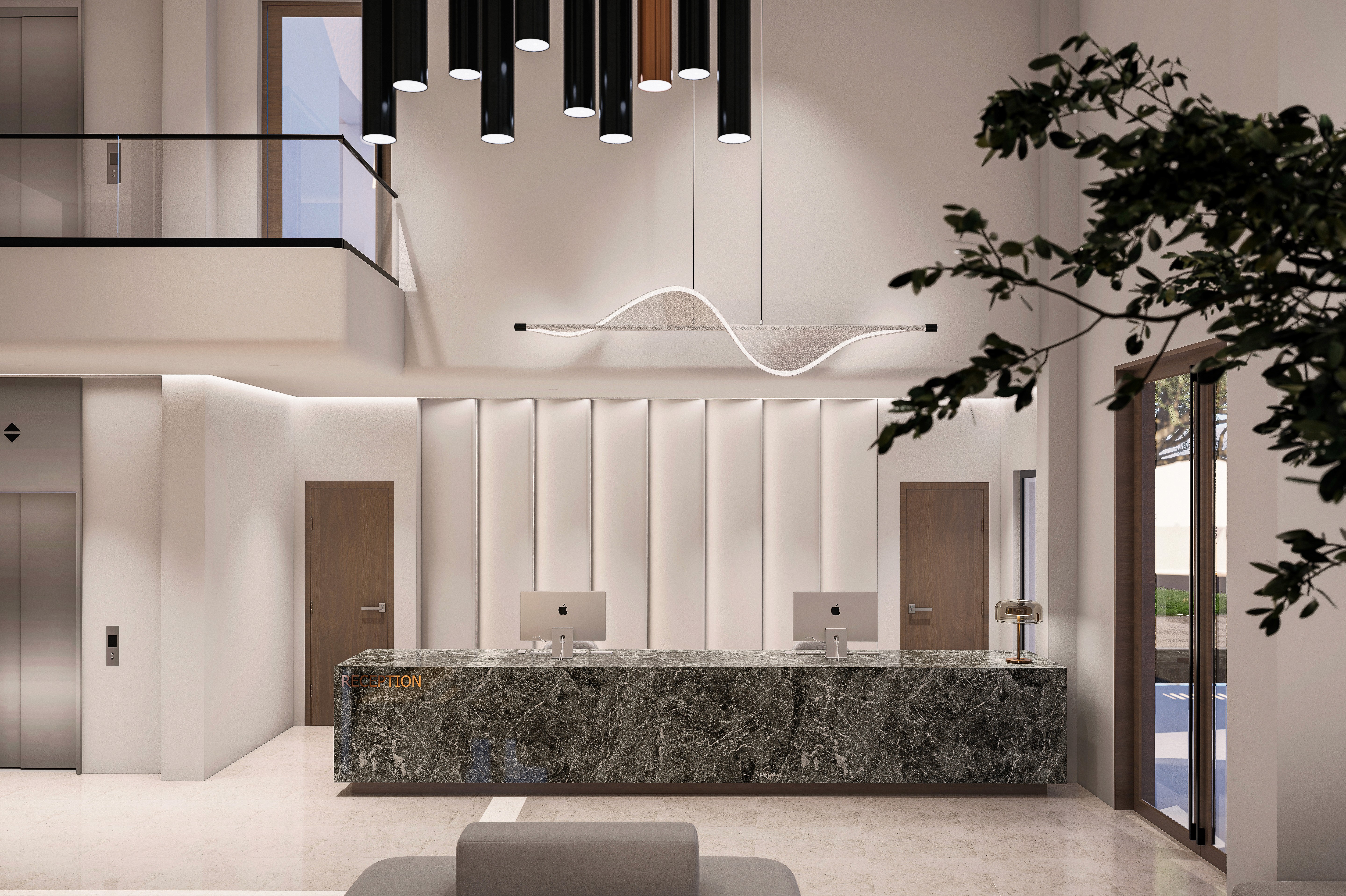 The suspended vertical cylindrical lightning fixtures on the waiting area enhances the vertical rhythm of the design accentuating the height of the space.