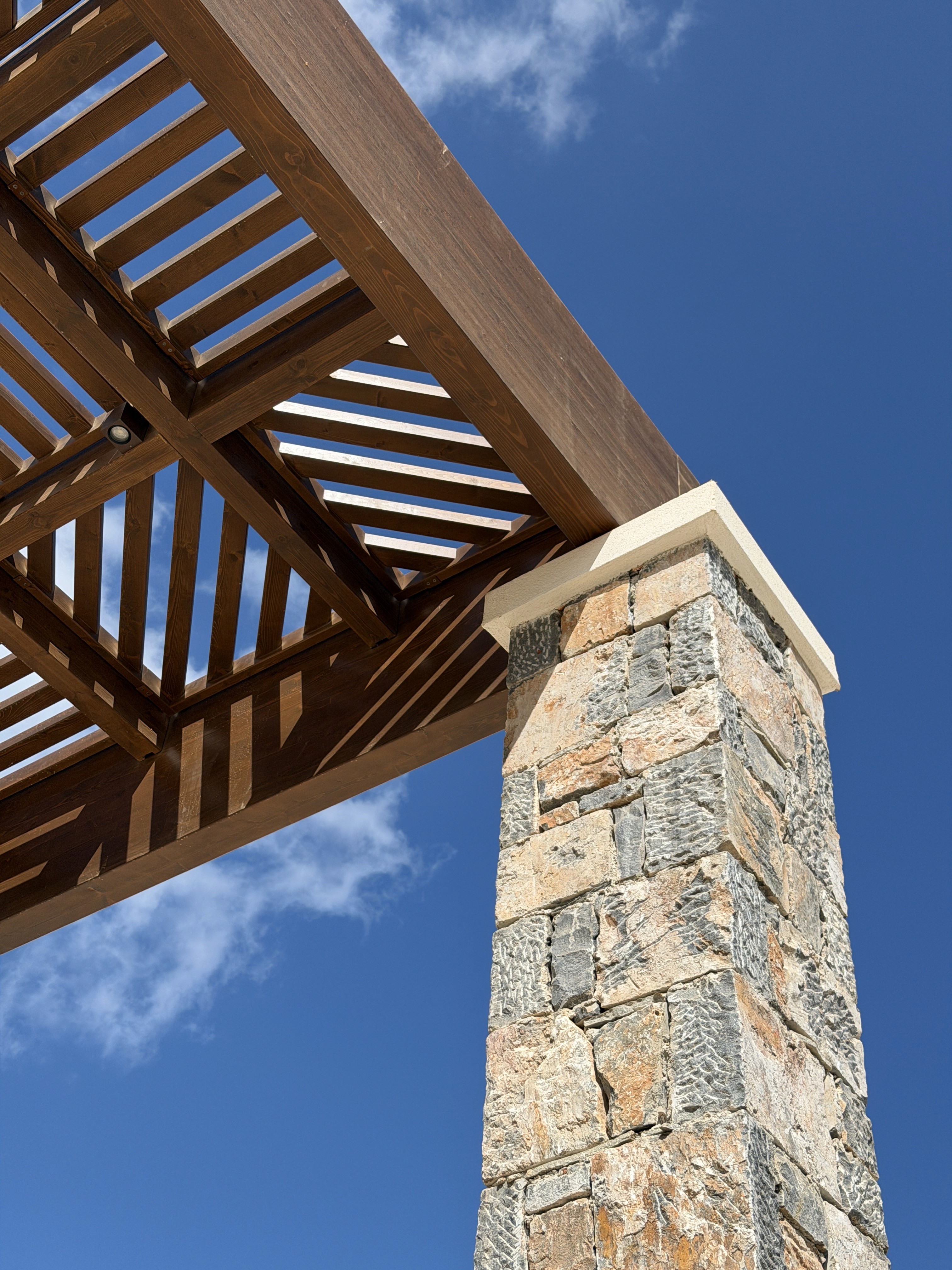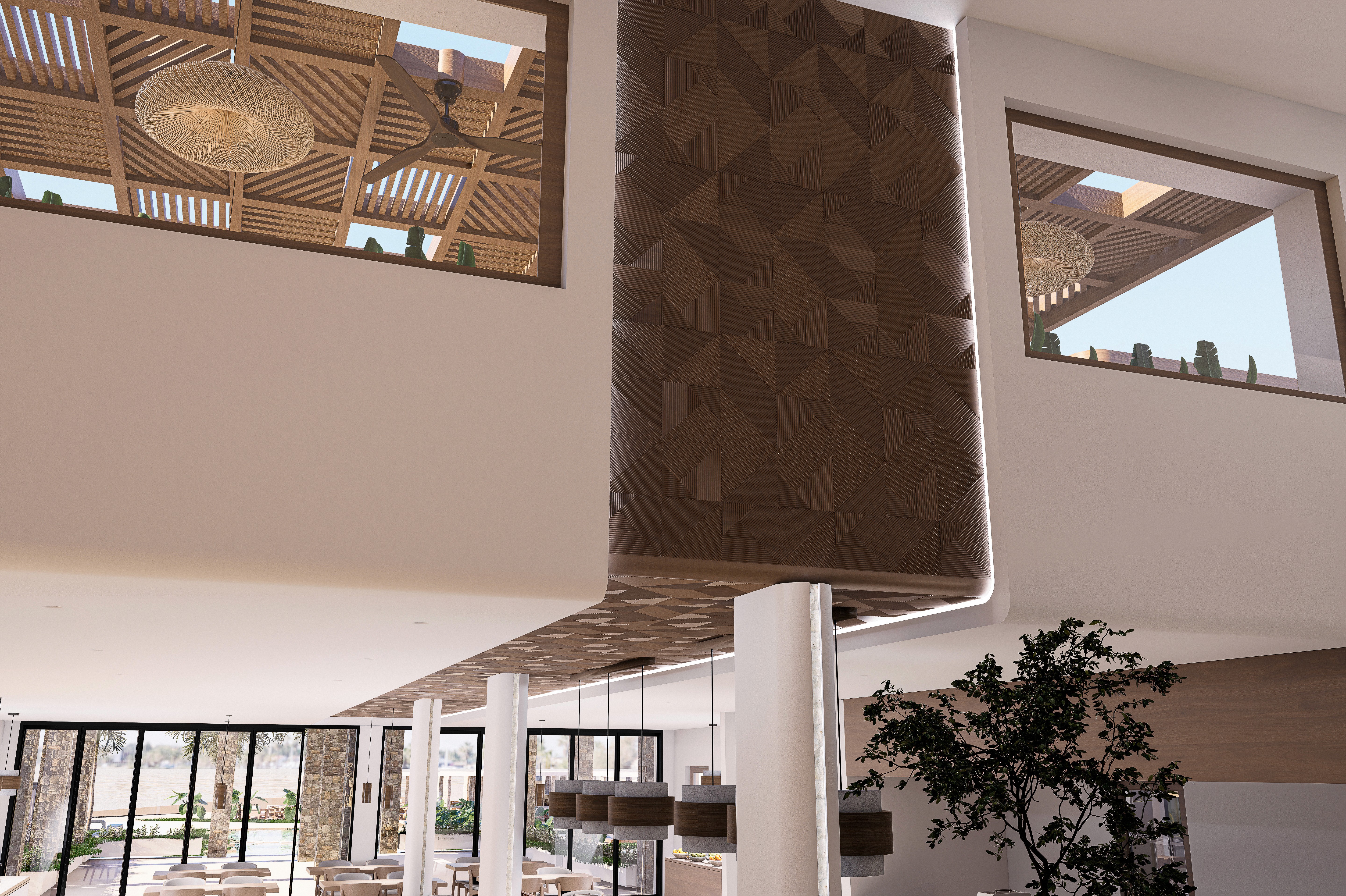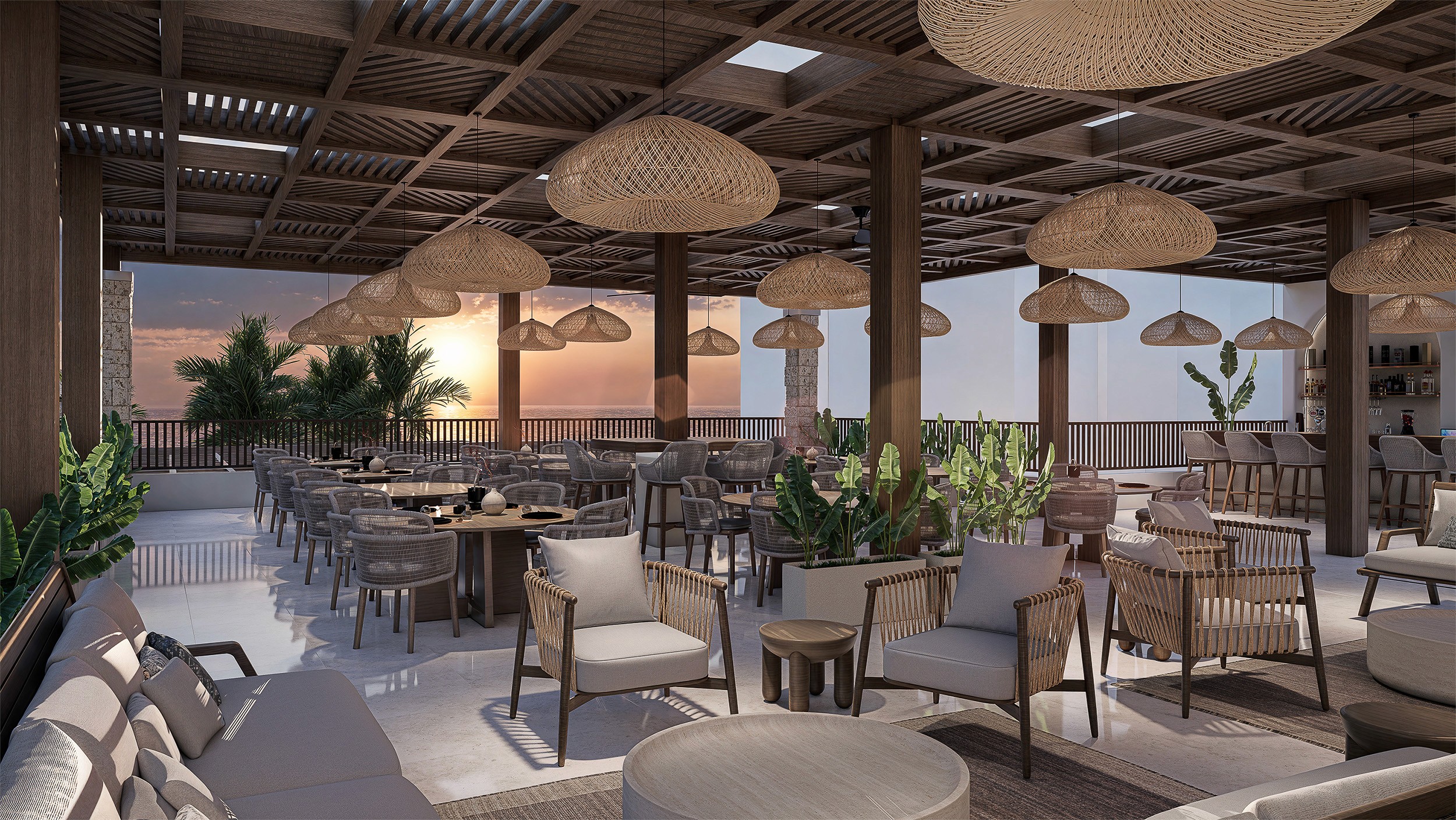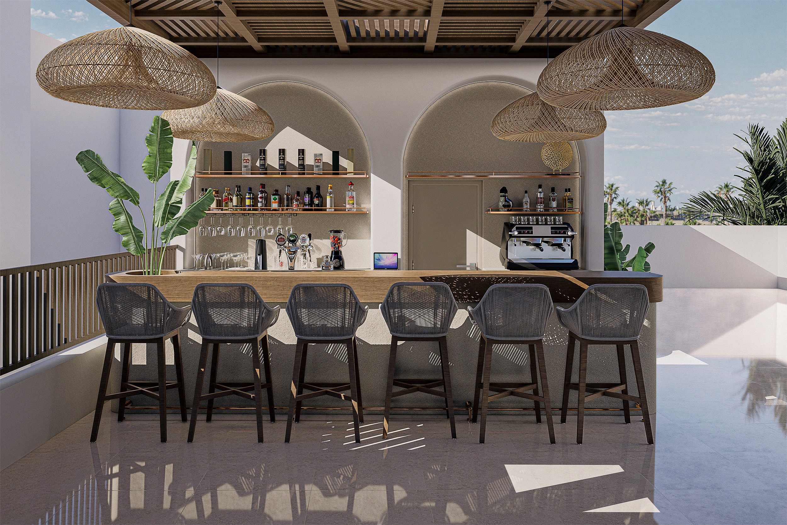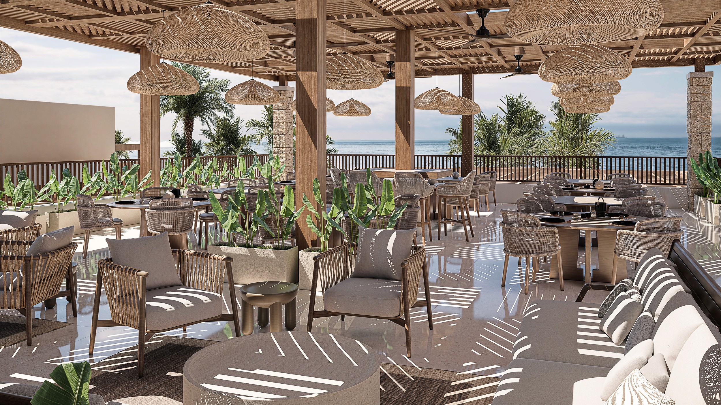 The terrace dining area is characterized by the timber pergola designed with a geometric pattern that is reminiscent of the interior design ethos and serves as a filter for the sunlight. Natural materials and textures dominate the terrace: woven lighting fixtures, the woven pergola, stone and wooden bar counters create an environment that feels grounded, welcoming, contemporary and luxurious.