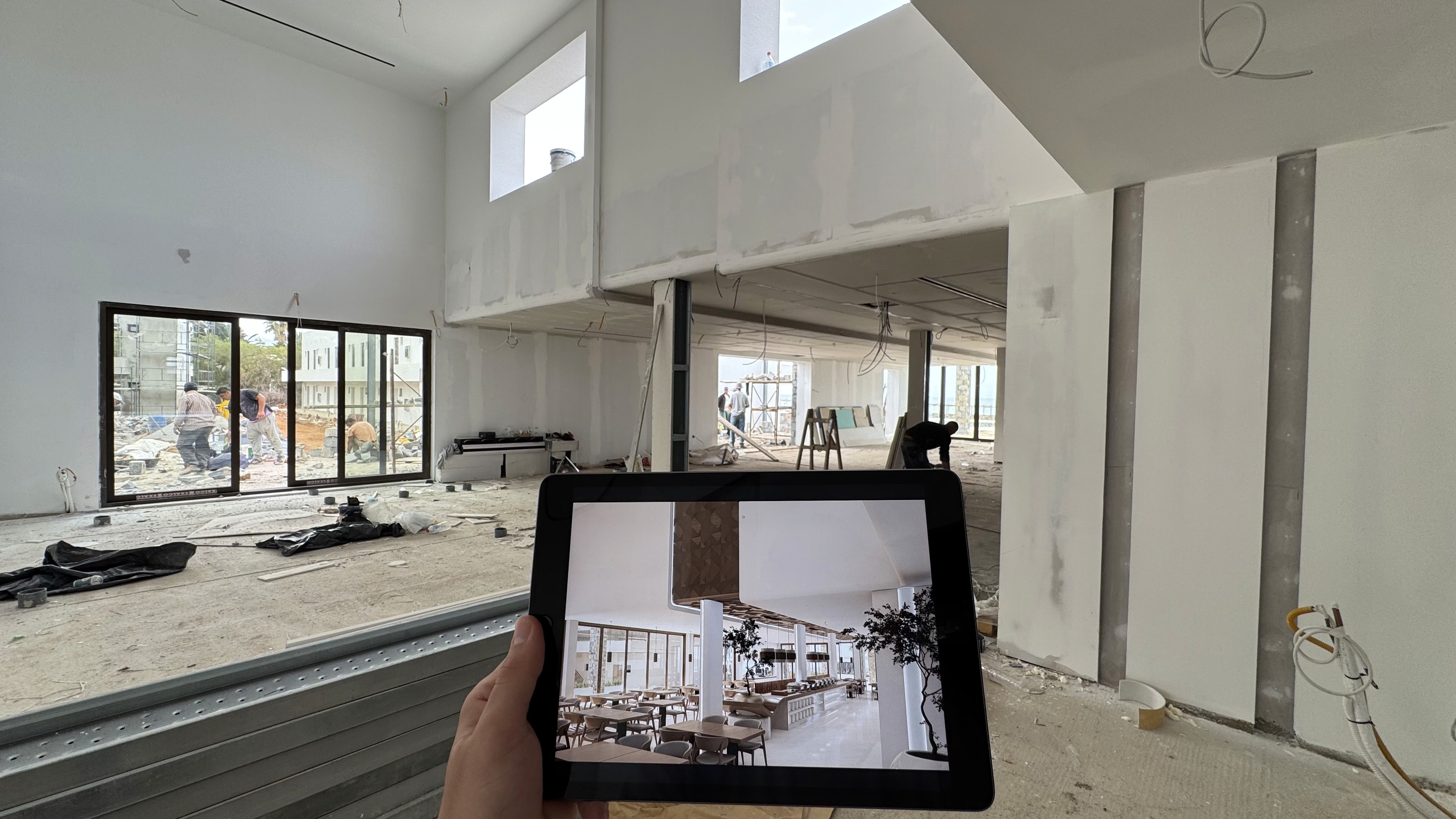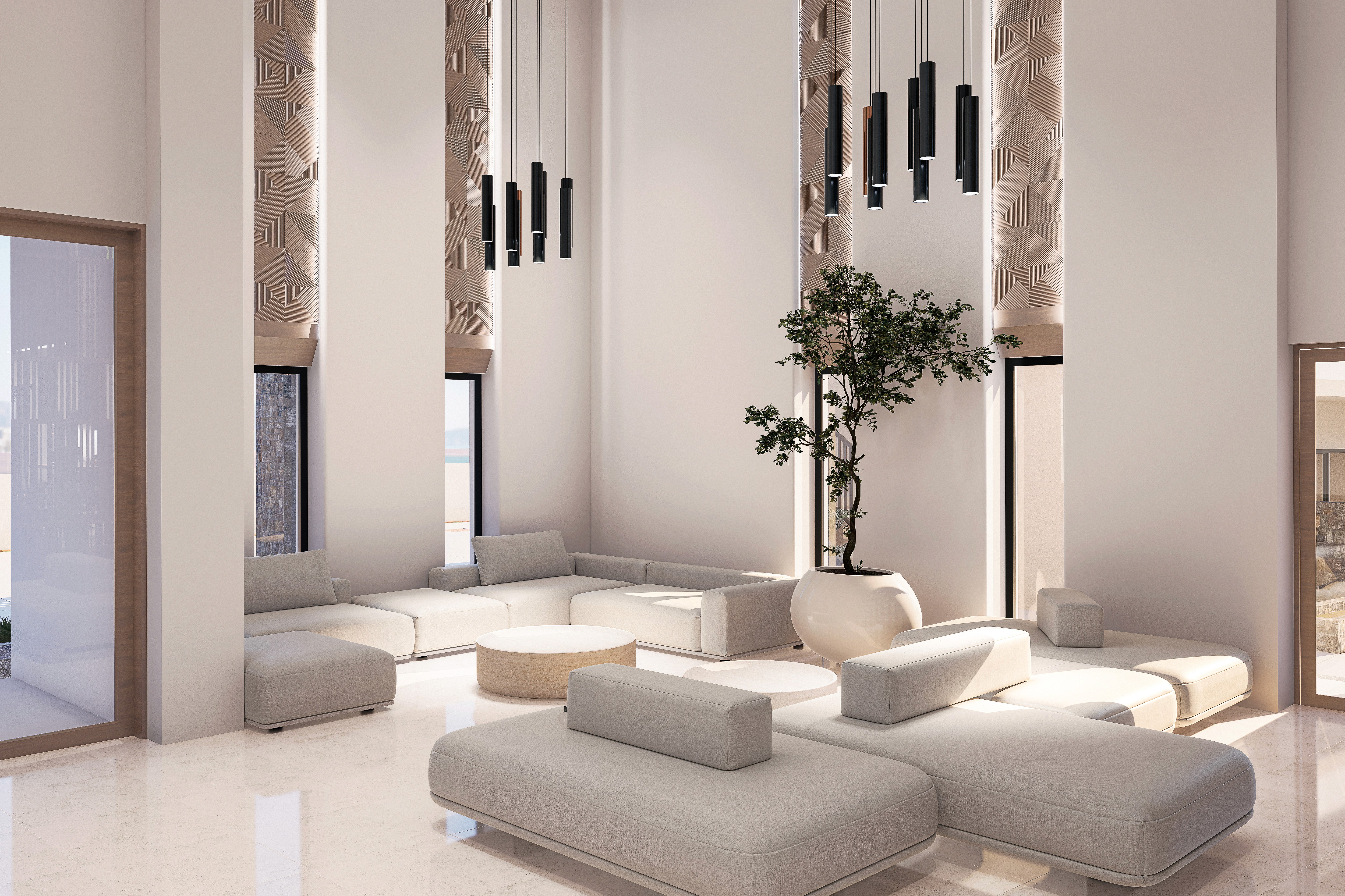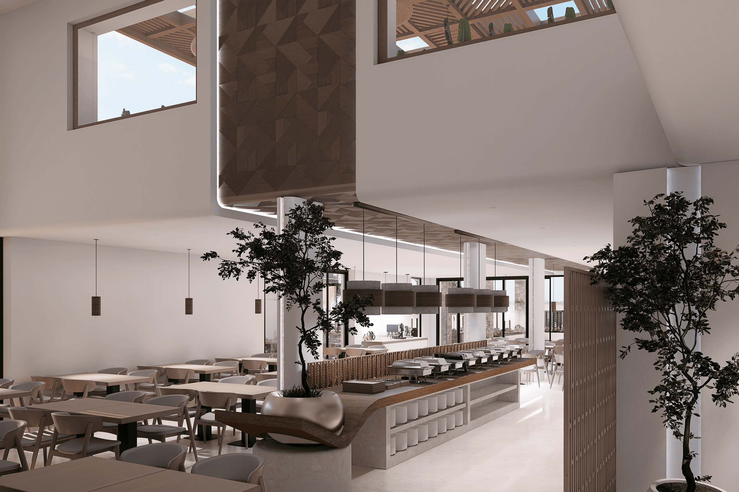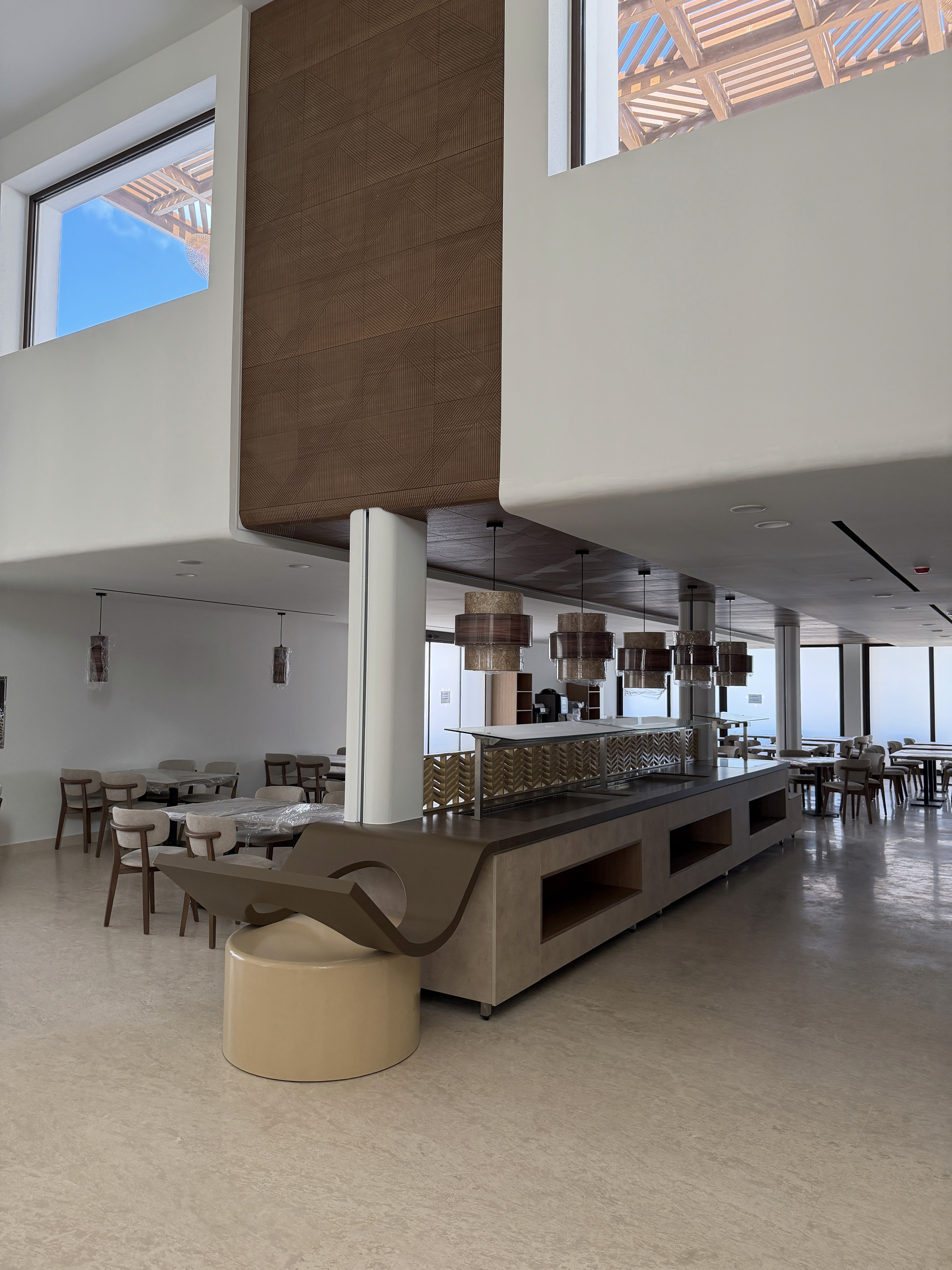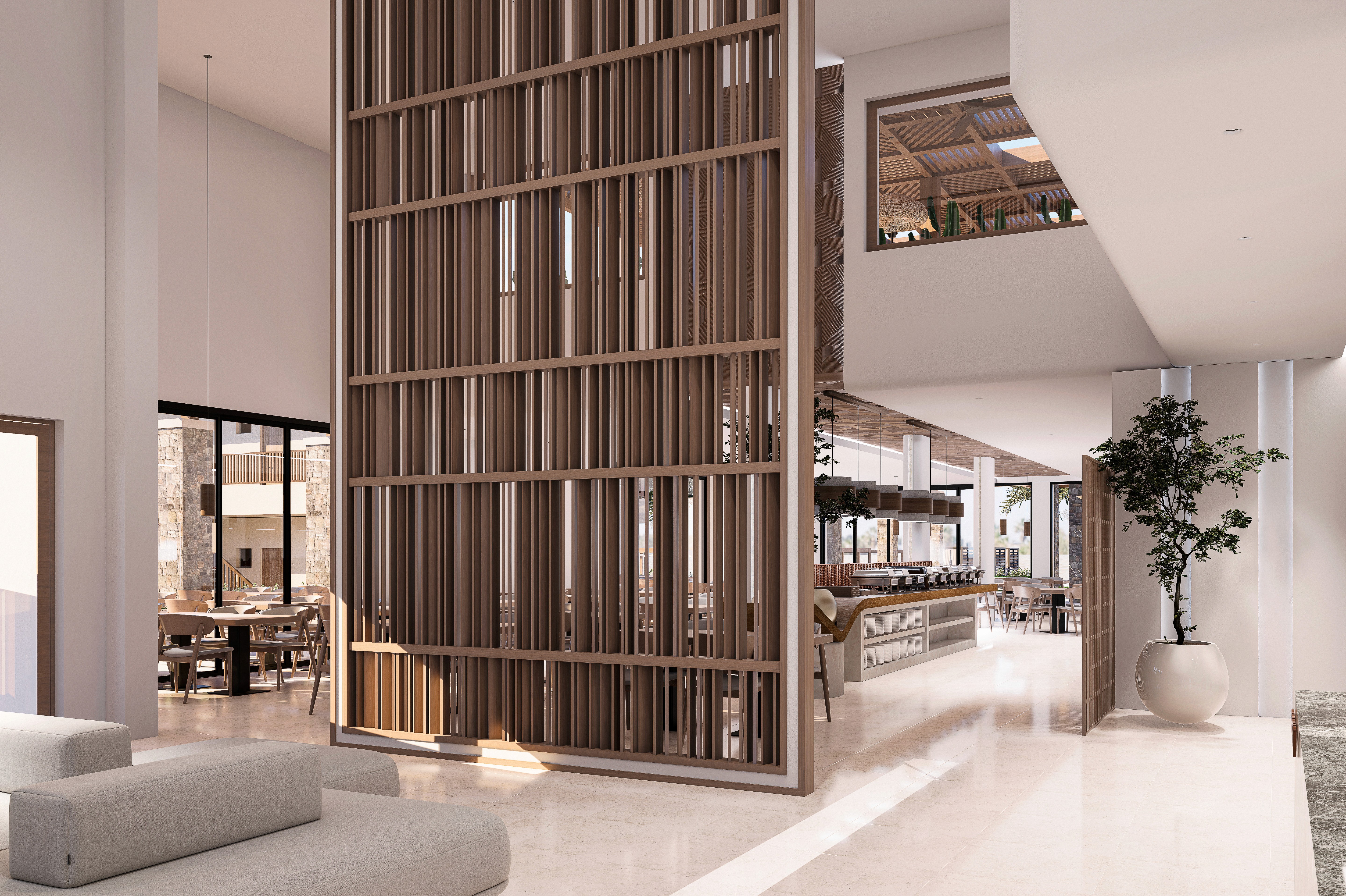 Sun Beach Hotel lobby, reception and buffet dining areas are conceived as a seamless spatial sequence that merges contemporary elegance with warm natural materiality. The architecture balances openness and intimacy crafting an environment that feels both calm and refined.