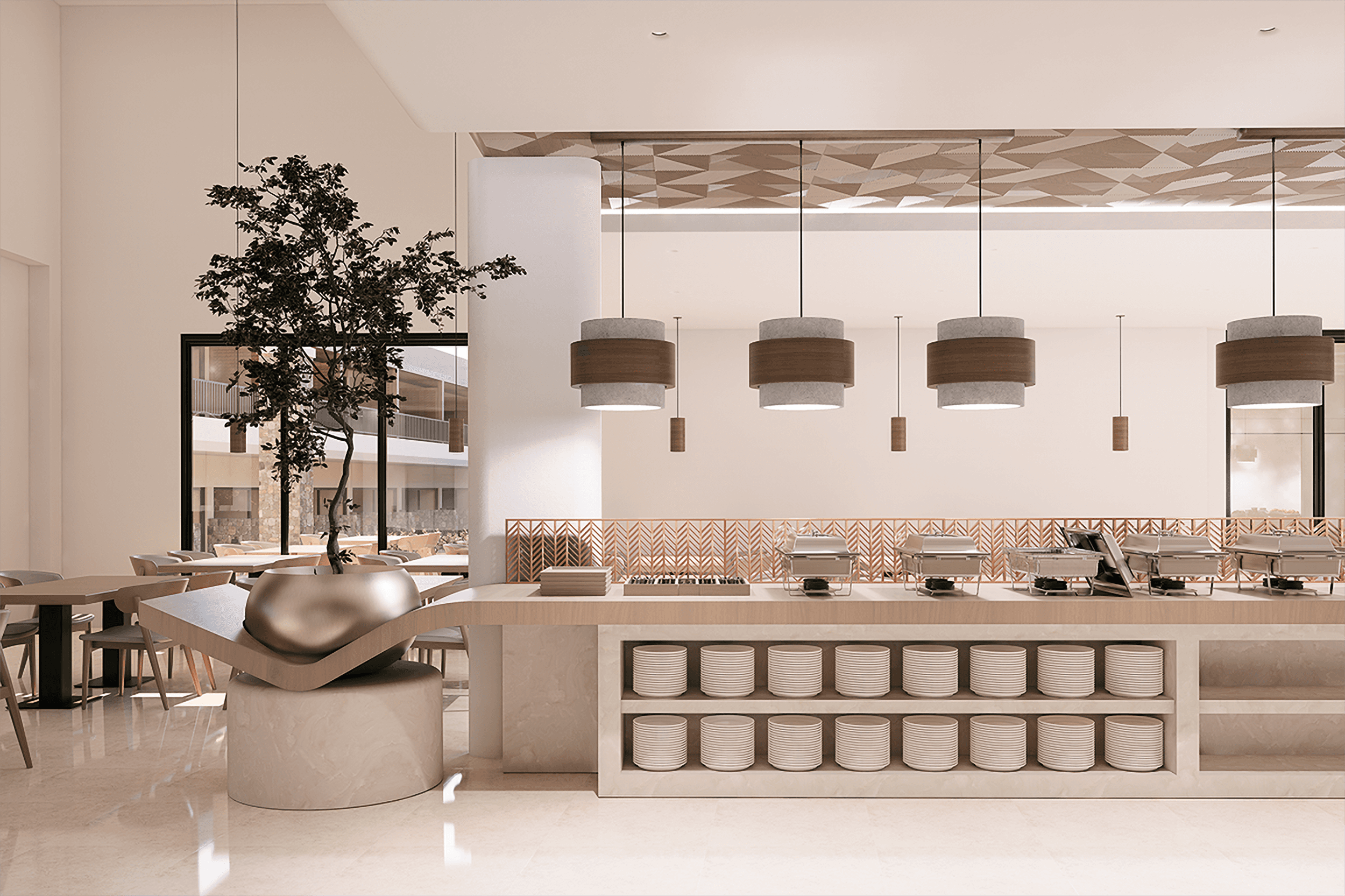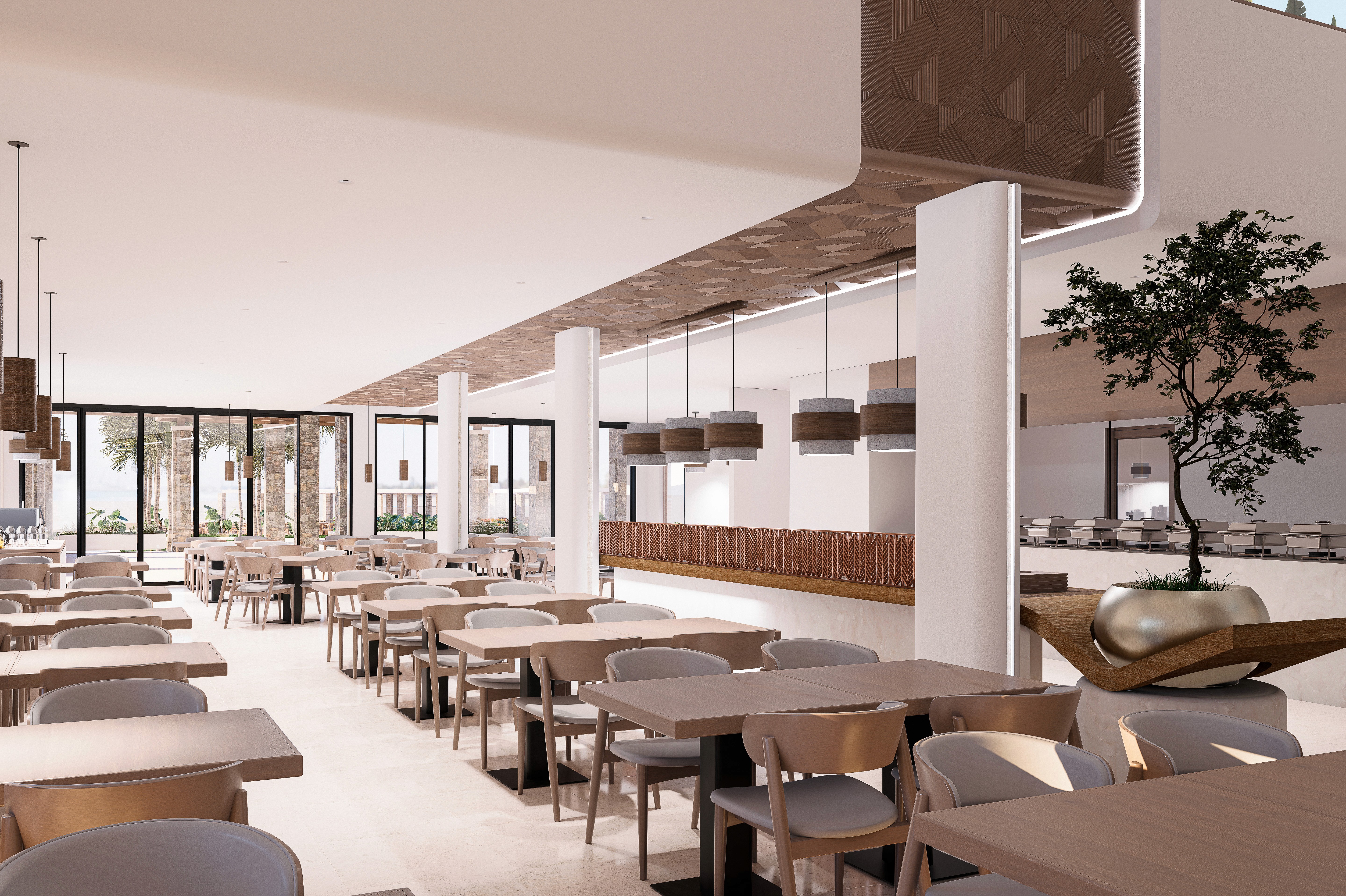 The dining area is structured around a long, sculptured buffet island that acts as both a functional core of the dining experience and an architectural element following the example of the lobby desk. Crafted in beige and brown tones incorporating the shelving for the service, the buffet presents itself as a contemporary component enhancing the linearity of the dining area. Above, hanging from the timber ceiling panel special circular lighting fixtures follow the colour and material palette of the space unifing the architectural design. Dining tables are arranged in a clear, linear grid that allows efficient circulation. Full height windoors allow sunlight to flow inside and connect the interior with the landscaped courtyards and terraces.