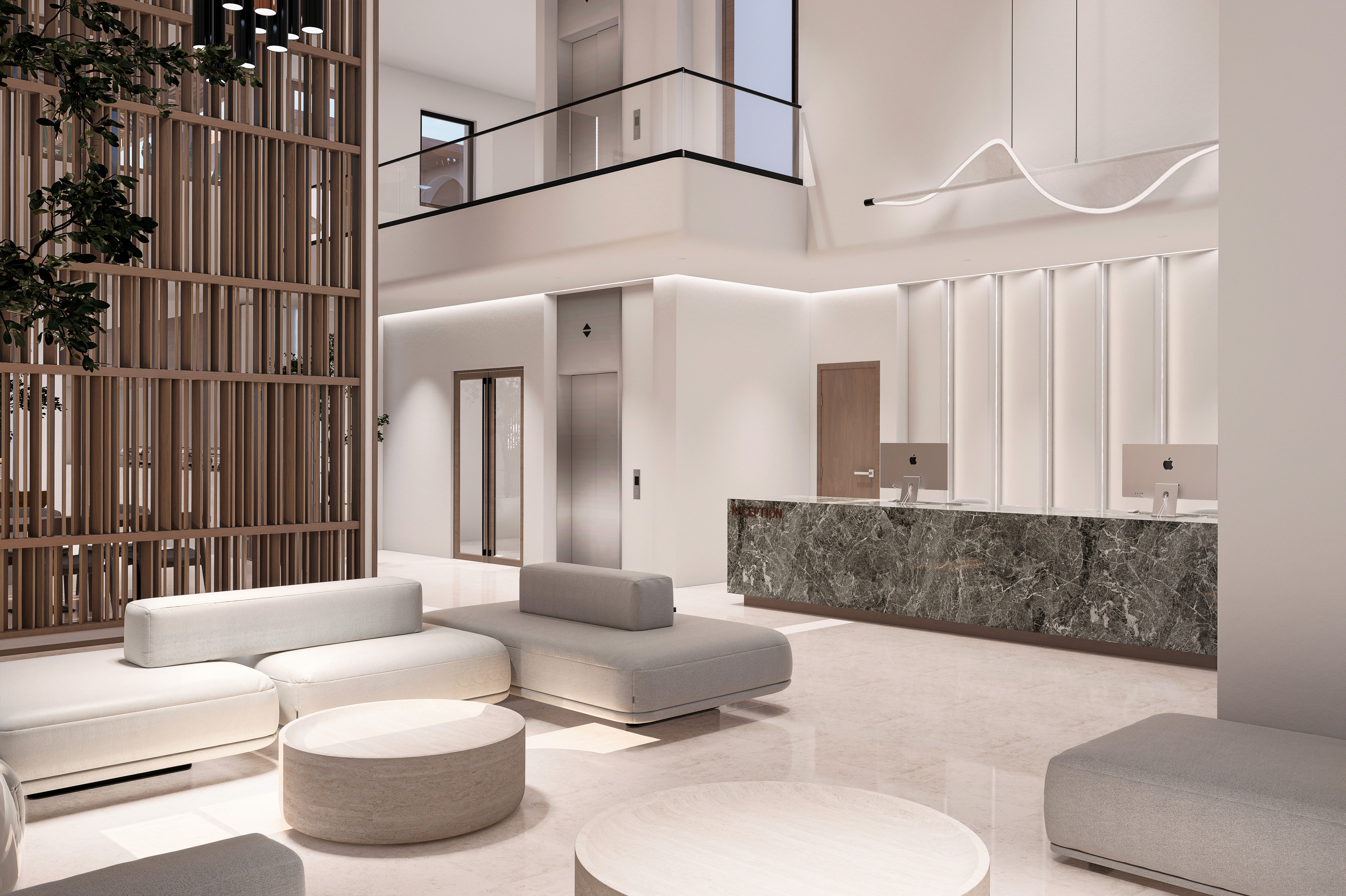 The double height volume of the lobby area creates a sense of verticality and modernity welcoming the guests with a taste of luxury. Daylight, textures and crafted decorative timber elements define a unique arrival experience. The lobby desk with its natural green marble face becomes a focal point for both function and design elevating the space with its elegant appearance.