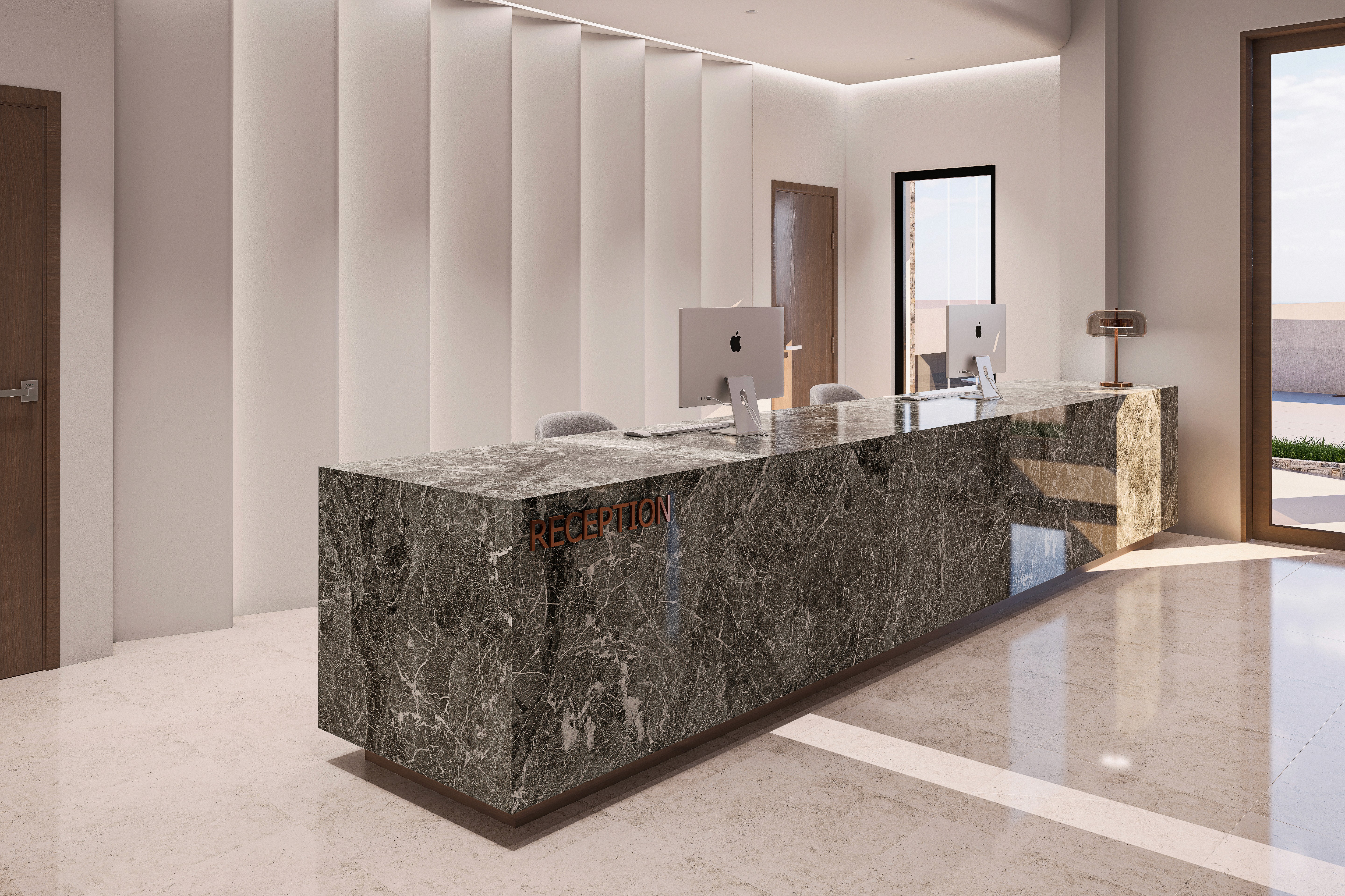 The white walls with the oak decorative elements crate a calm, refined and relaxing atmosphere akin to a seaside resort while allowing the striking green marble face of the lobby desk to become the protagonist catching the attention of anyone entering the space.