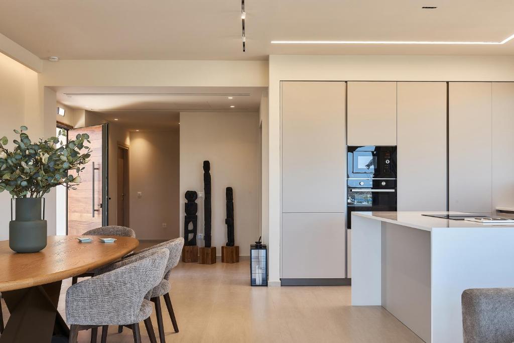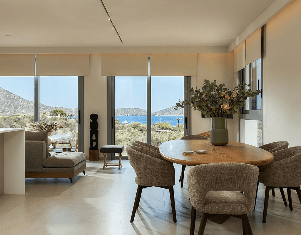 The living areas are designed as a thoughtful blend of modern minimalism with understated elegance. The furnitures enhance the warm, organic aesthetic while the earthly tones emphasize the relaxing and harmonious ambience. Each item in the living, dining and kitchen areas offer unmatched comfort without sacrificing aesthetic appeal. The open plan design ensures effortless and fluid transitions between the areas and seamlessly extends into the sea side view terrace and the outdoor space. The large glazings dissolve the boundaries between the indoor and outdoor areas inviting the beautiful cretan landscape inside.