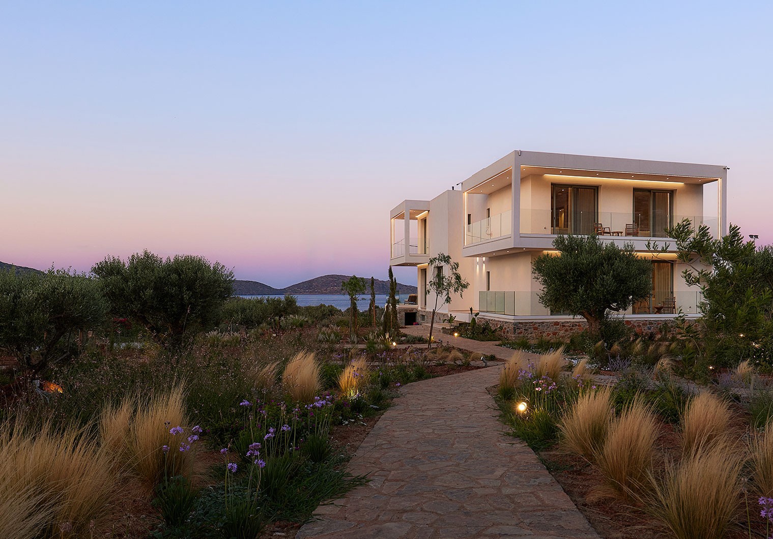 The design thoughtfully integrates indoor and outdoor living, emphasizing sustainability, relaxation, and a strong connection to the surrounding environment. The garden’s layout is defined by clean lines and a curated use of native flora. The stone structures pays homage to traditional Mediterranean craftsmanship while supporting a modern lifestyle focused on outdoor dining and entertaining. The area is designed for multifunctional use all while surrounded by the tranquil ambiance of olive groves.