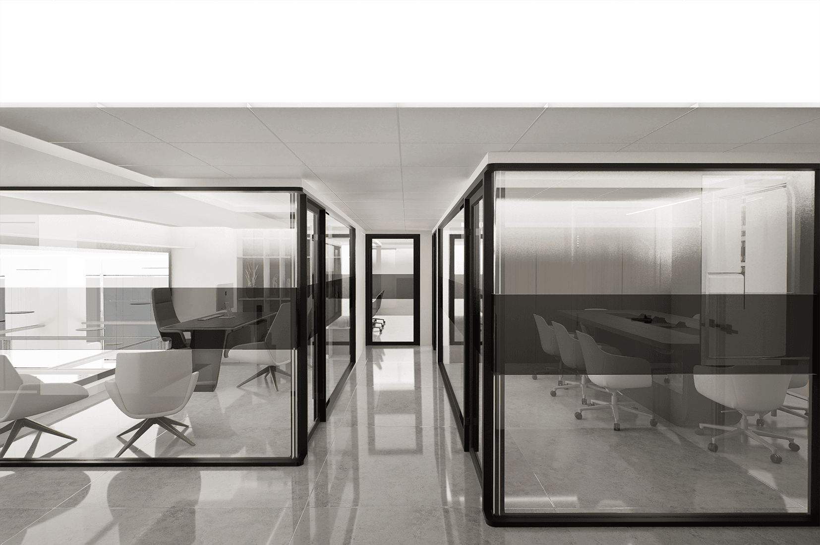 Τα γραφεία της διοίκησης έχουν άμεση οπτική επαφή με τον βασικό χώρο εργασίας, δίνοντας τη δυνατότητα εποπτείας της λειτουργίας του γραφείου. Οι χώροι αυτοί ορίζονται με υαλοστάσια σε μαύρα μεταλλικά πλαίσια, που εξασφαλίζουν διαφάνεια και οπτική σύνδεση, διατηρώντας παράλληλα την απαραίτητη ηχομόνωση και ενισχύοντας τη φιλοσοφία του γραφείου για ανοιχτότητα και συνεργασία.
