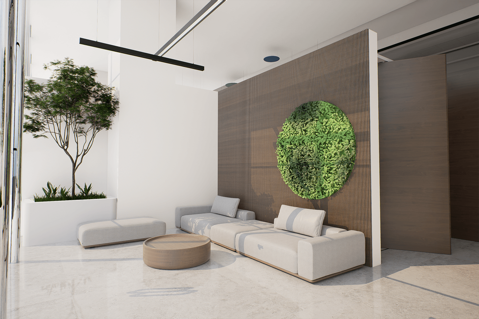 Το πράσινο χρησιμοποιείται σε όλο τον χώρο ως στοιχείο διακριτικού διαχωρισμού. Παράλληλα, αναβαθμίζει αισθητικά το περιβάλλον, βελτιώνει την ποιότητα του αέρα, μειώνει την αντήχηση και συμβάλλει στη βελτίωση της απόδοσης των εργαζομένων, μειώνοντας το άγχος.